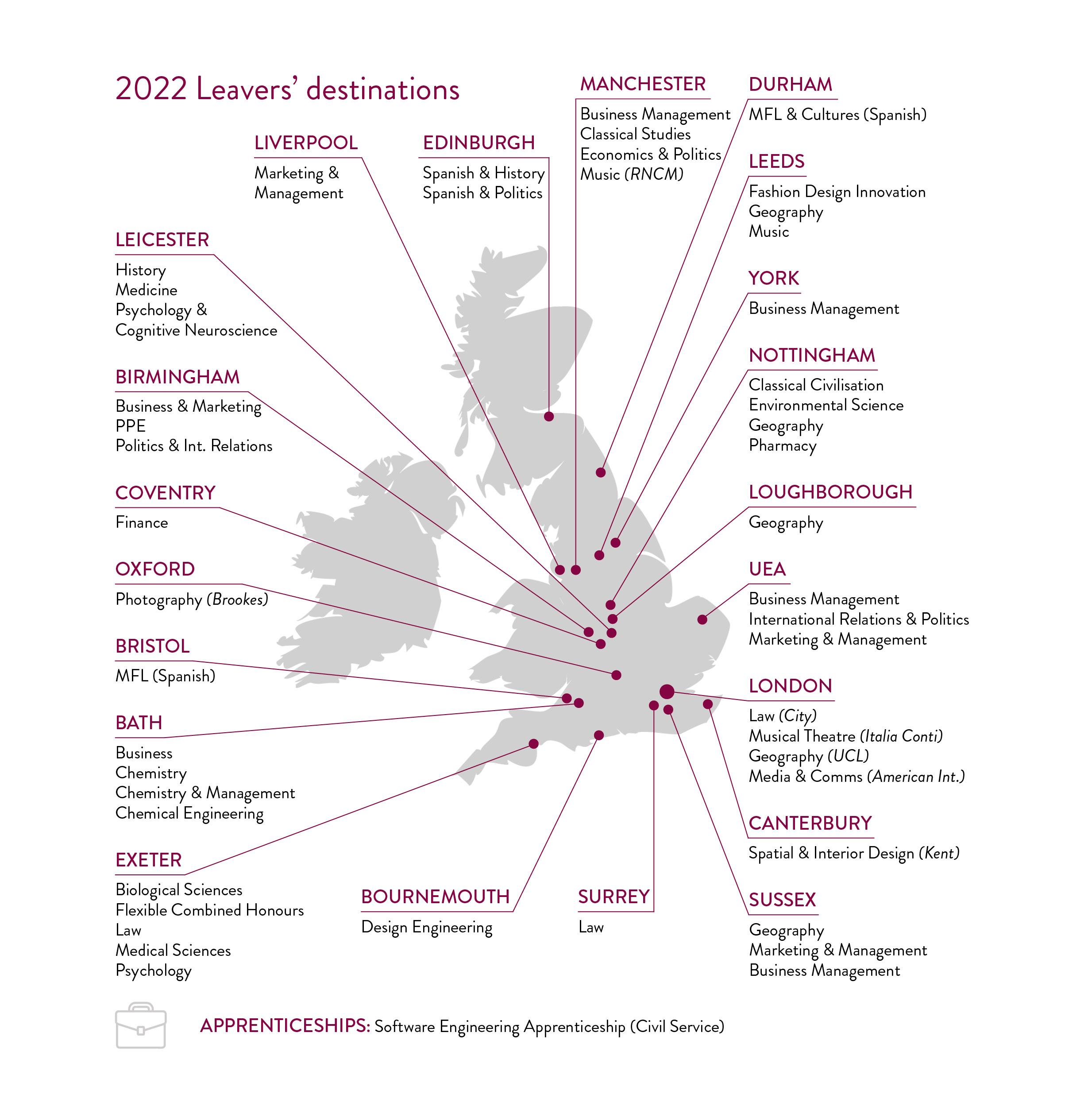 Our Upper Sixth leavers embark on remarkable journeys as they set their sights on diverse higher education destinations across the UK, from Cambridge to Central Saint Martins, Edinburgh to Exeter, our students spread their wings far and wide. We also take pride in our students pursuing education abroad, with some venturing to esteemed international institutions in the United States of America and The Netherlands. The range of courses our students undertake is truly expansive, reflecting their unique passions and aspirations.