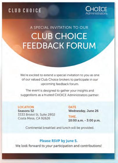 Design Firm: The Word & Brown Companies Client: CHOICE Administrators Title: Club CHOICE Feedback Forum Creative Director: Homer Villegas, Studio Director Writer: Rikki Nedelkow, Marketing Director