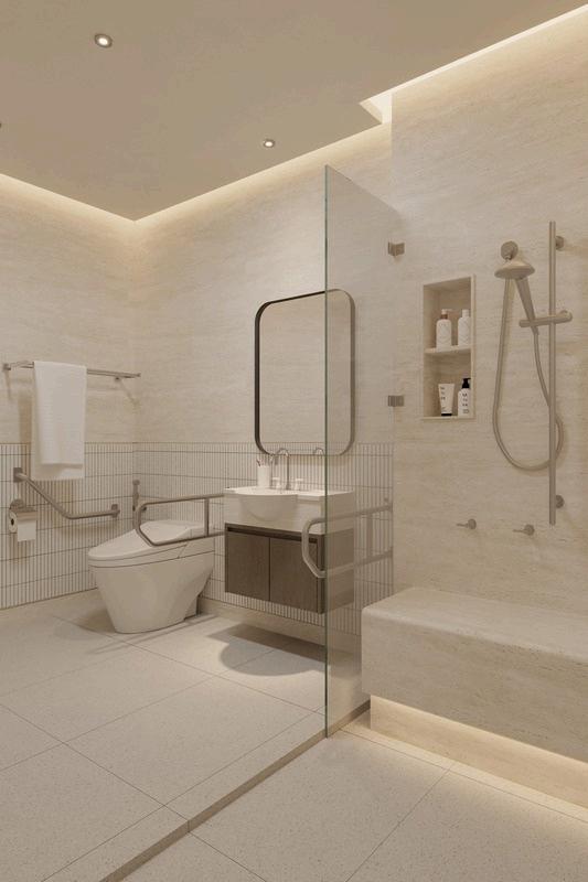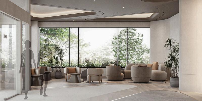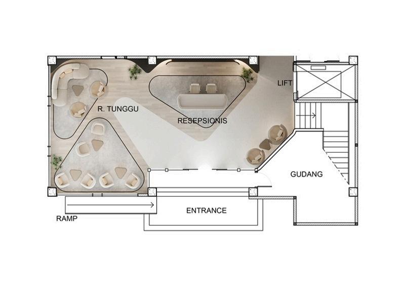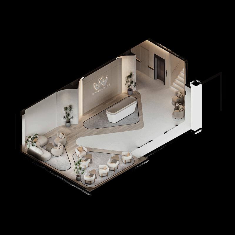 Lobi dan ruang tunggu di panti jompo berfungsi sebagai area penyambutan dan ruang interaksi bagi penghuni, keluarga, dan tamu. Desain interiornya harus memperhatikan kenyamanan, aksesibilitas untuk pengguna kursi roda, serta sirkulasi yang luas. Selain itu, penambahan handrail di koridor dan tangga dapat meningkatkan keamanan bagi lansia.