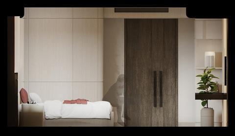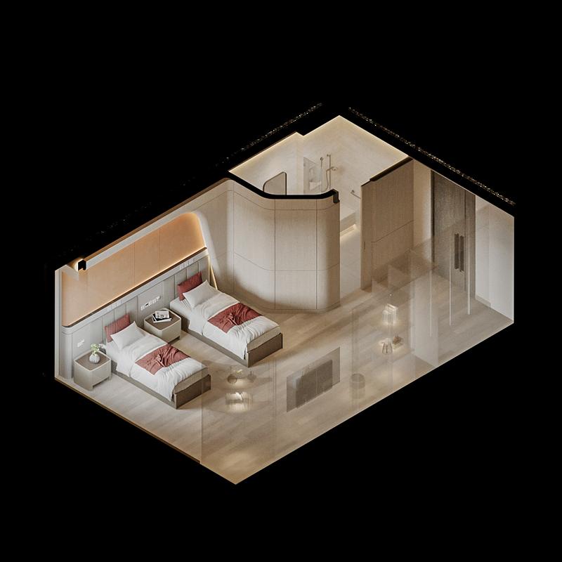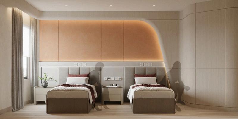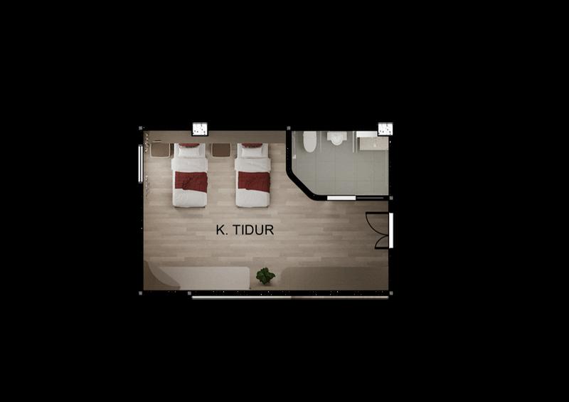Ruang kamar tidur yang dirancang dengan 2 tempat tidur untuk memberikan tempat tinggal yang aman, nyaman, dan mendukung kesejahteraan fisik dan emosional para penghuni lansia, dengan memperhatikan kebutuhan khusus mereka terkait mobilitas, aksesibilitas bagi lansia yang memiliki kebutuhan kursi roda. serta penerapan jendela sebagai pencahayaan alami yang dapat mendukung aktivitas lansia. Selain itu terdapat penerapan material yang aman terhadap lansia seperti halnya dengan lantai linoleum yang dapat meminimalisir resiko cedera ketika terjatuh.