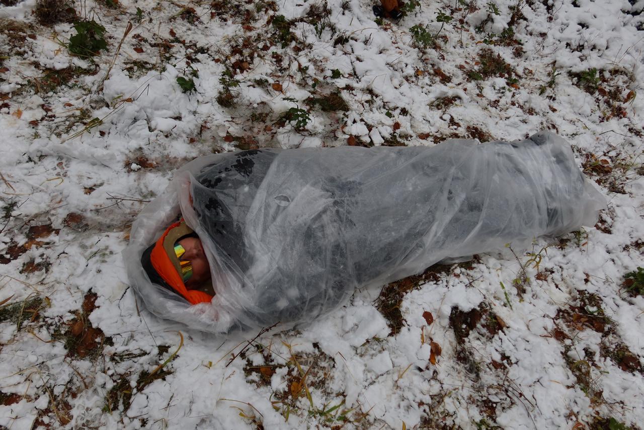 If hypothermia progresses, the patient may stop shivering due to energy depletion and show a profound decrease in mental status, muscle rigidity and a lowered heart and respiratory rate. This is severe hypothermia, a life-threatening condition. The patient likely will not be able to swallow, so giving warm drinks and food will not be possible. In cases of moderate or severe hypothermia, the patient should be put in a hypothermia wrap (hypo-wrap) or “hypo-burrito”. Many useful modifications can be made to improve the hypo-wrap and can be viewed online or learned in a wilderness medicine course. However, the basic principles of the hypo-wrap remain the same in all variations. Begin by heating water bottles or activating chemical heat packs. Lay the patient down on a large, waterproof sheet, such as a plastic tarp or drop cloth. Put the patient in at least one sleeping bag or wrap in blankets with an insulating pad underneath. Place the bottles or heat packs in the critical areas mentioned above, including by the feet. Finally, wrap the patient in the waterproof sheeting by tucking the edges under the patient to keep warmth inside the wrap. A cloth or scarf may be placed over the patient’s mouth to prevent evaporative heat loss.