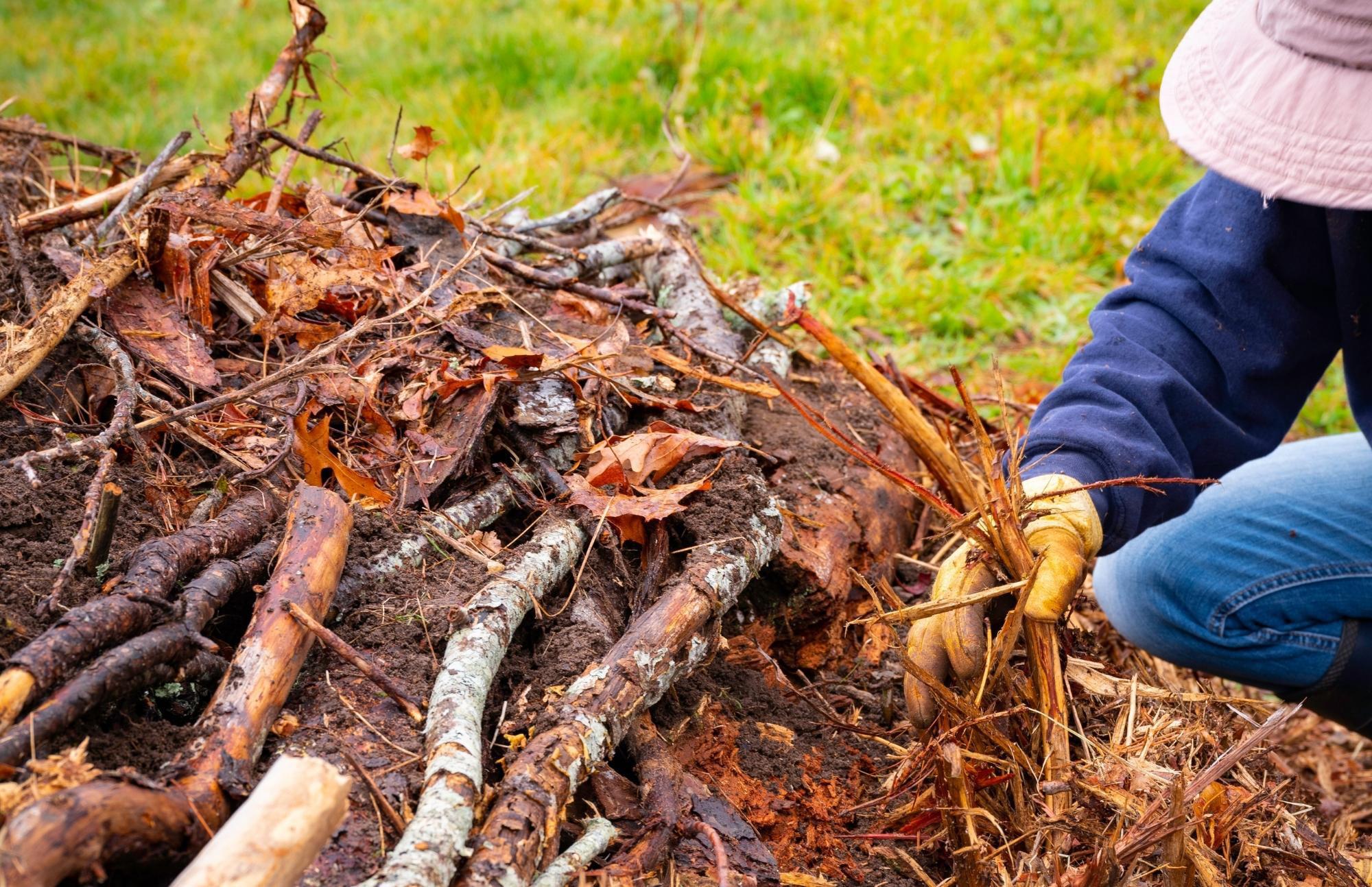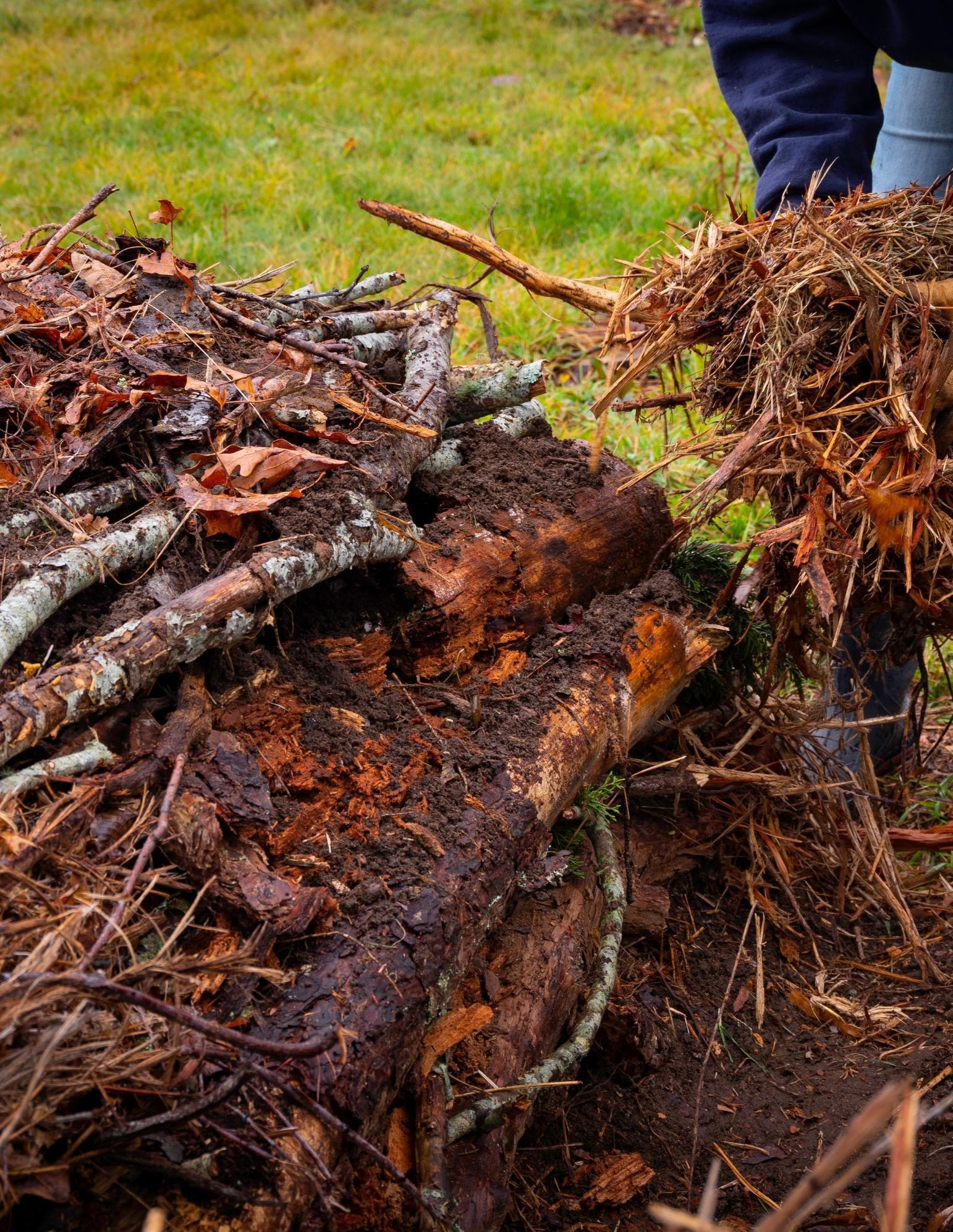 the thickest and largest pieces of rotting wood at the bottom and then slowly start to pile on thinner and smaller pieces of dried and/or rotting wood. Many folks say it is best to use hardwood logs at the bottom and then use softer woods as you layer up. If you don’t have the luxury of selecting different hardness’s of old wood you might have available, do not worry about it. If you don’t have any larger old wood at all, then use what you have. Bark, smaller branches and clippings that have had time to dry out, dry leaves, dried grass clippings are all fine, but the larger the wood pieces can be at the bottom, the better.