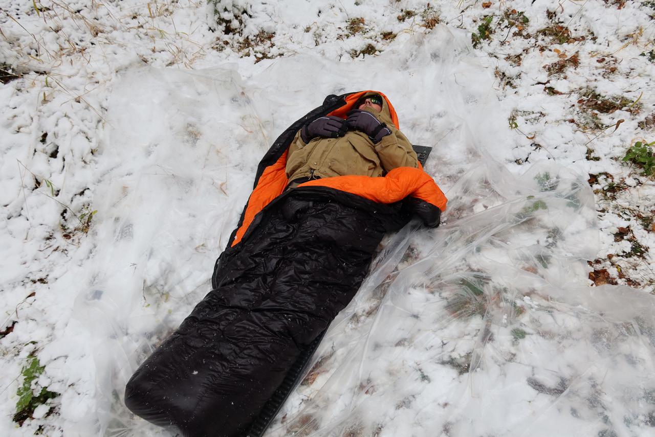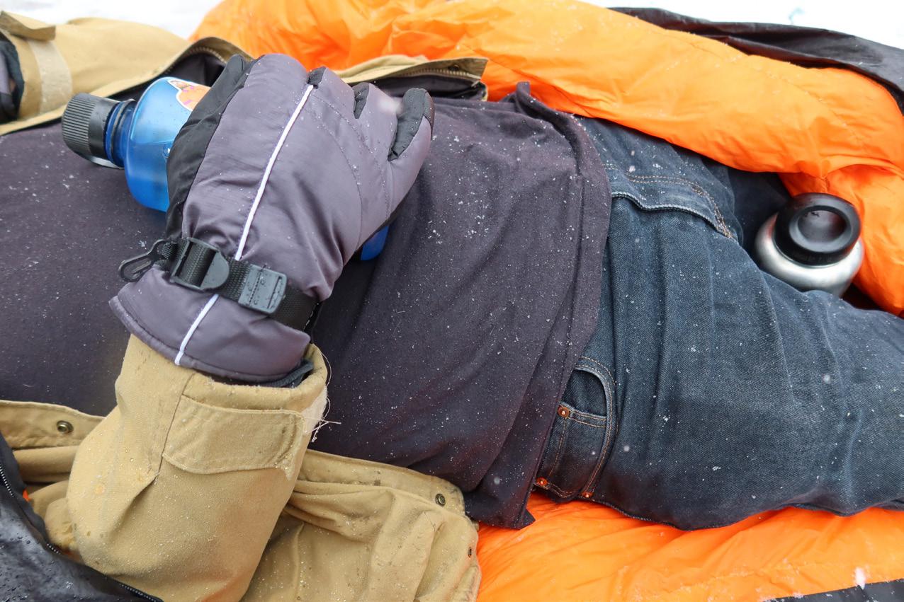 If hypothermia progresses, the patient may stop shivering due to energy depletion and show a profound decrease in mental status, muscle rigidity and a lowered heart and respiratory rate. This is severe hypothermia, a life-threatening condition. The patient likely will not be able to swallow, so giving warm drinks and food will not be possible. In cases of moderate or severe hypothermia, the patient should be put in a hypothermia wrap (hypo-wrap) or “hypo-burrito”. Many useful modifications can be made to improve the hypo-wrap and can be viewed online or learned in a wilderness medicine course. However, the basic principles of the hypo-wrap remain the same in all variations. Begin by heating water bottles or activating chemical heat packs. Lay the patient down on a large, waterproof sheet, such as a plastic tarp or drop cloth. Put the patient in at least one sleeping bag or wrap in blankets with an insulating pad underneath. Place the bottles or heat packs in the critical areas mentioned above, including by the feet. Finally, wrap the patient in the waterproof sheeting by tucking the edges under the patient to keep warmth inside the wrap. A cloth or scarf may be placed over the patient’s mouth to prevent evaporative heat loss.