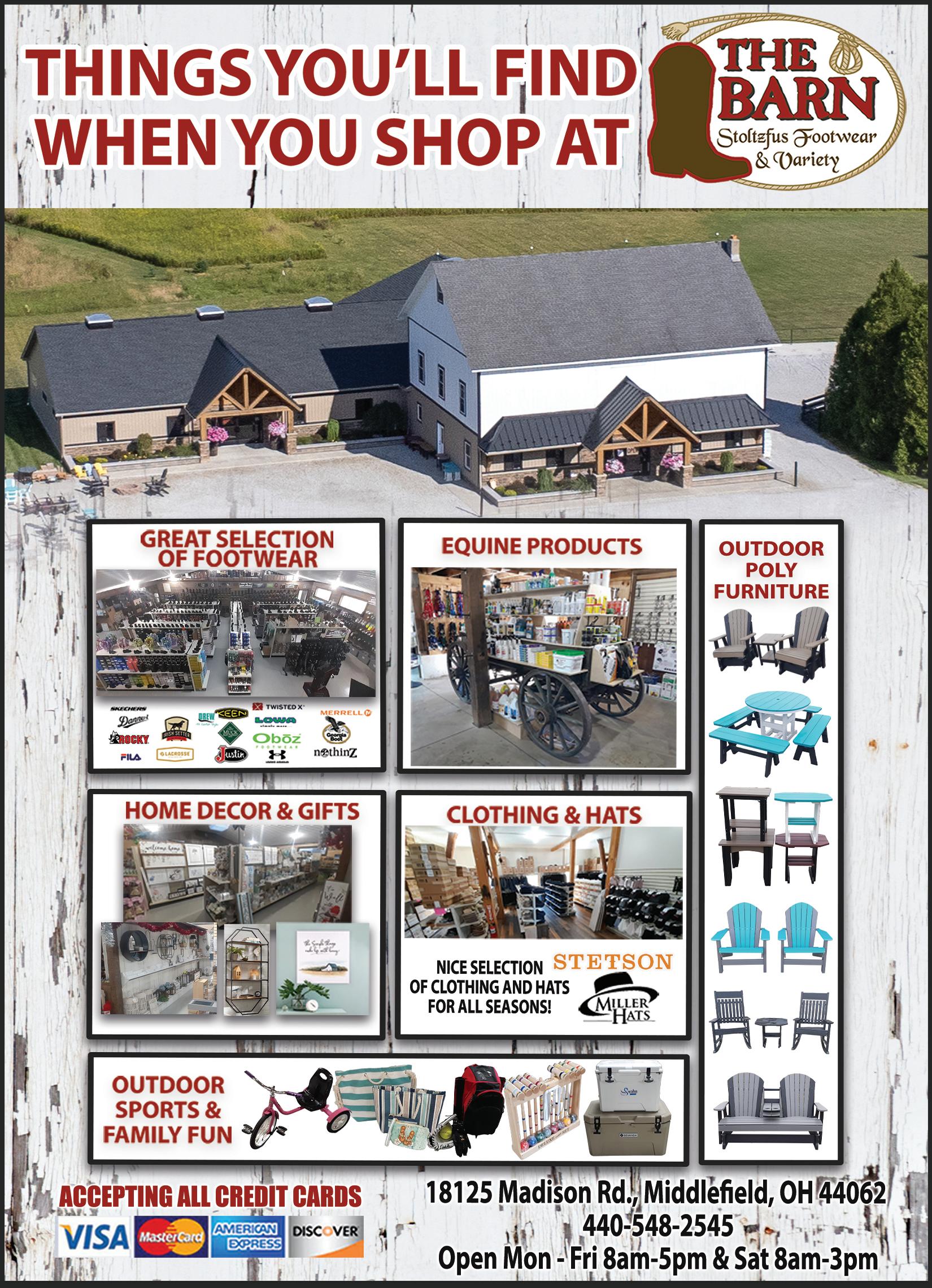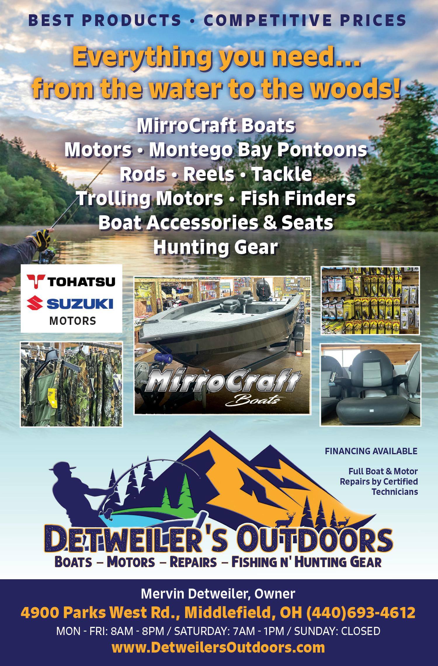 Detweiler’s Outdoors Mervin Detweiler 4900 Parks West Rd. Middlefield 440-693-4612 Grand Valley Footwear & Outdoors Alan R. Stutzman 4061 U.S. Rt. 322 Orwell 440-437-7080