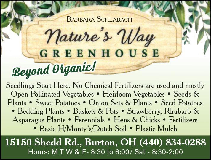 Heritage Naturals Daniel Fisher 15005 S. Springdale Ave. Middlefield 440-632-0316 Miller’s Herbs & Variety Dan C. & Clara Miller 13015 Hayes Rd. Middlefield 440-636-5659 Nature’s Way Greenhouse Barbara Schlabach 15150 Shedd Rd. Burton 440-834-0288
