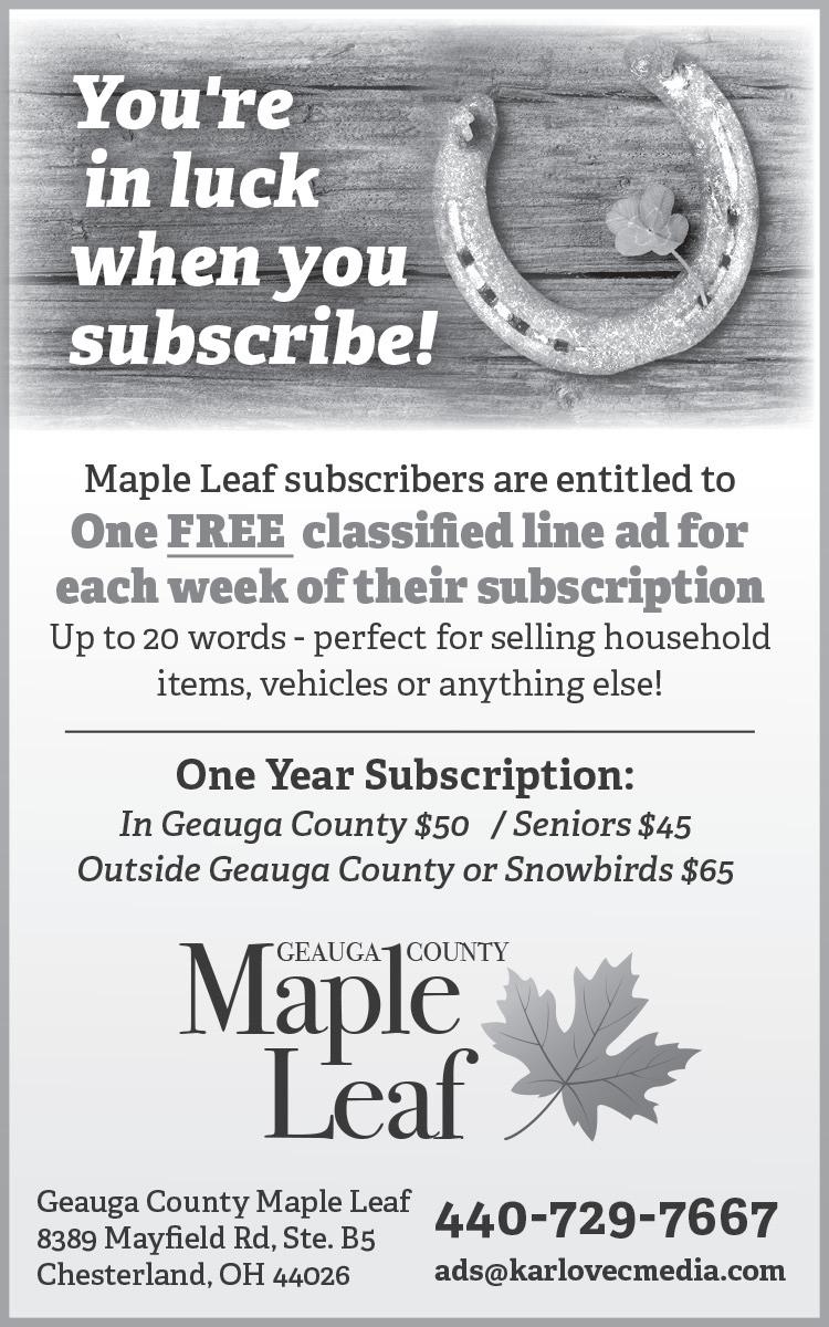 1. FREE one-year online-only subscription to the Geauga County Maple Leaf, a six-time winner of Ohio Newspaper of theYear, OR