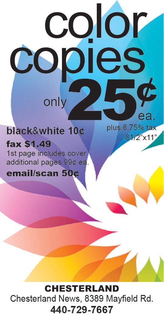 • The opinions and representations contained in advertisements are those of the advertiser. They have not been verified by the Chesterland News, LLC, nor should they be construed to represent the position or viewpoint of this newspaper or its publisher.
