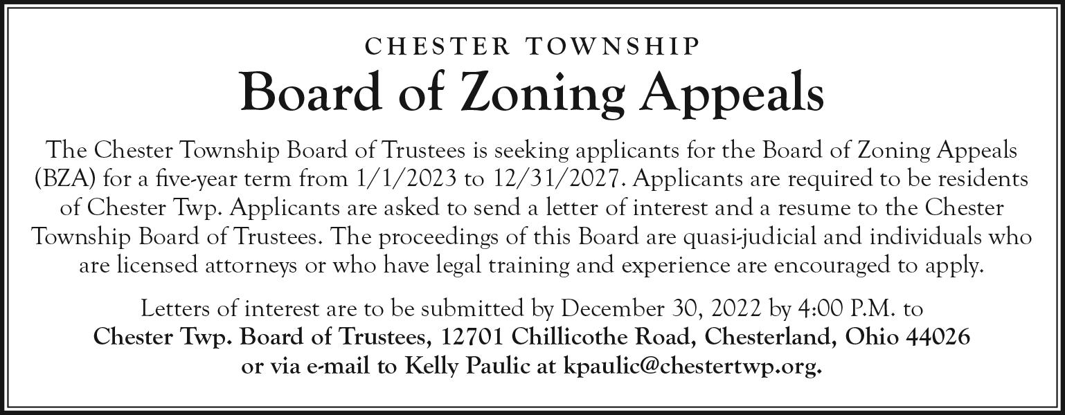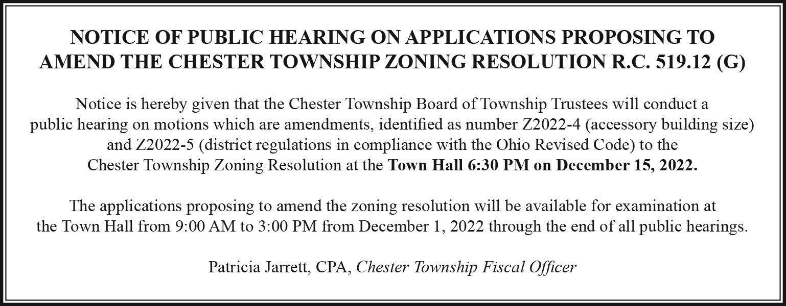 • The Chesterland News, LLC reserves the right to reject or revise any advertisement or news item for publication. Letters to the Editor reflect the opinion of those signing them and not necessarily that of either the Chesterland News, LLC, its affiliates or its advertisers. All letters submitted are subject to editing, and none will be returned.