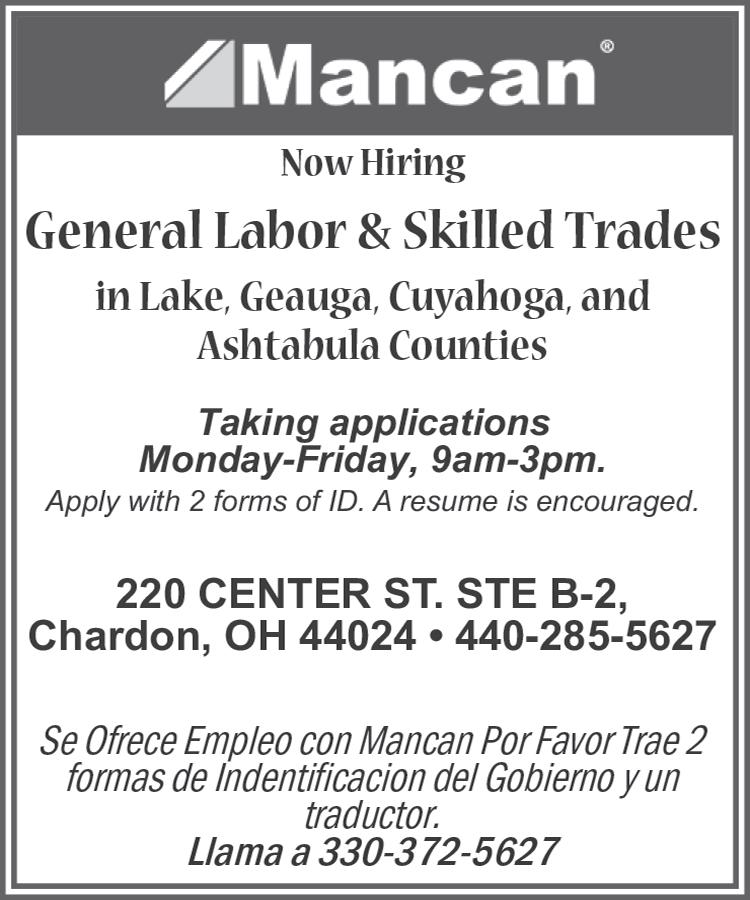 your ad directly to ads@karlovecmedia.com ☐ Here is my ad. The per week cost is $12 for the first 20 words, plus 50¢ for each additional word. ☐ I am a PAID MAPLE LEAF SUBSCRIBER entitled to 20 WORDS or less FREE each week. (Words over 20 will be billed at 50¢ per word.) NO BUSINESS ADS. Please include subscriber number ___________ (found on mailing label) ☐ I would like to be a MAPLE LEAF SUBSCRIBER and advertise for FREE. Enclosed is $50 for an in-county 12-month subscription (subscription rate valid through 12/31/22) 1 2 3 4 5 6 16 17 18 10 11 12 13 14 15 7 8 9 19 20 21 22 23 24 Number of weeks to run ad: Free Subscriber Ads can run a maximum of four weeks, then MUST be renewed. NAME ADDRESS CITY, STATE, ZIP PHONE EMAIL NAME ON CARD BILLING ADDRESS PAYMENT INFORMATION Make checks payable to “Karlovec Media Group.” Credit card charges will appear as “Karlovec Media Group.” SIGNATURE CARD # EXP CVC Code ☐ Mastercard ☐ Visa ☐ Discover ☐ American Express karlovec group 8389 Mayfield Road, B-5 Chesterland, OH 44026 Fax: 440-729-8240 All classified line ads run in The Geauga County Maple Leaf on Thursdays, and in the Chesterland News and Middlefield Post on the weeks each newspaper is published. The Chesterland News and Middlefield Post are published every other week on opposing weeks. Chardon Tavern and Grill. Short order cook. Starting at