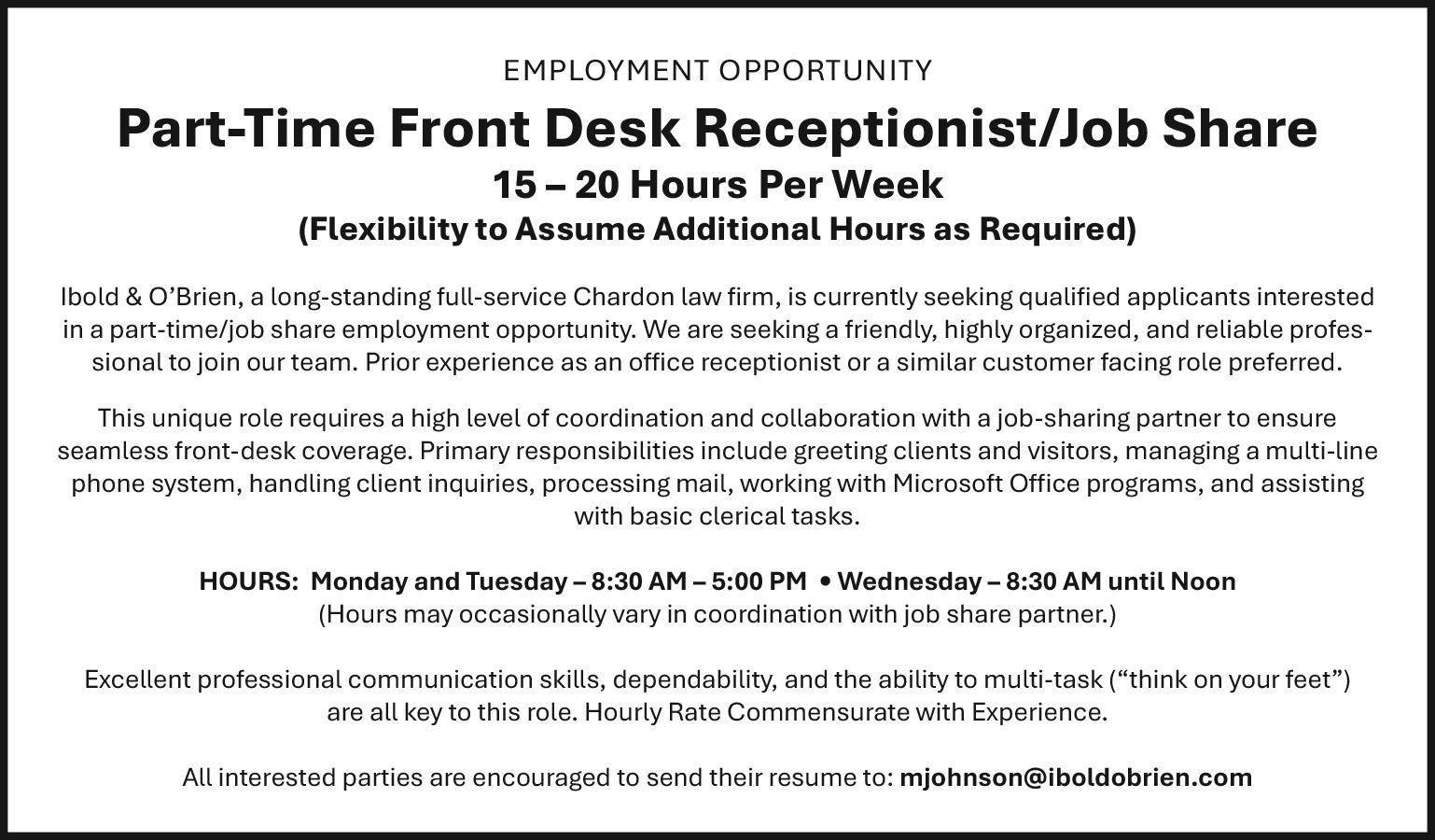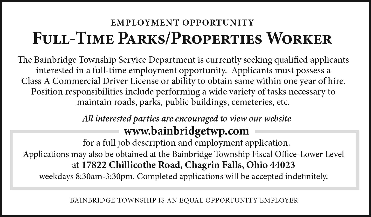 Bidders are required to use Township Bid form obtained from the office of the Fiscal Officer or on the Township’s website at www.Bainbridgetwp.com. All Bids shall be enclosed in a sealed envelope marked “Sealed Bid for Road Maintenance Materials.” Proposals for the above shall not be combined with any other Bid(s). Bidder may elect to bid on all items listed or any portion thereof. The Township Trustees reserve the right to reject any, or all, bids to accept a primary and an alternate supplier or suppliers and to wave any irregularities. Proposals must be valid for 20 days. Bids will be opened at 10:05 A.M. on February 20, 2026 at the Bainbridge Fire Department Meeting Room.