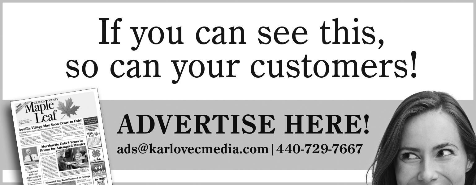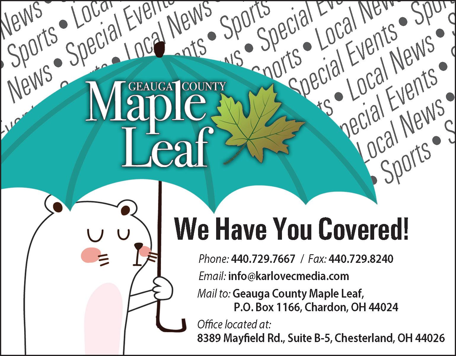 • The space reservation deadline for paid advertisements in that Thursday’s Geauga County Maple Leaf is the preceding Friday by noon. Late ads may be accepted at the discretion of management.
