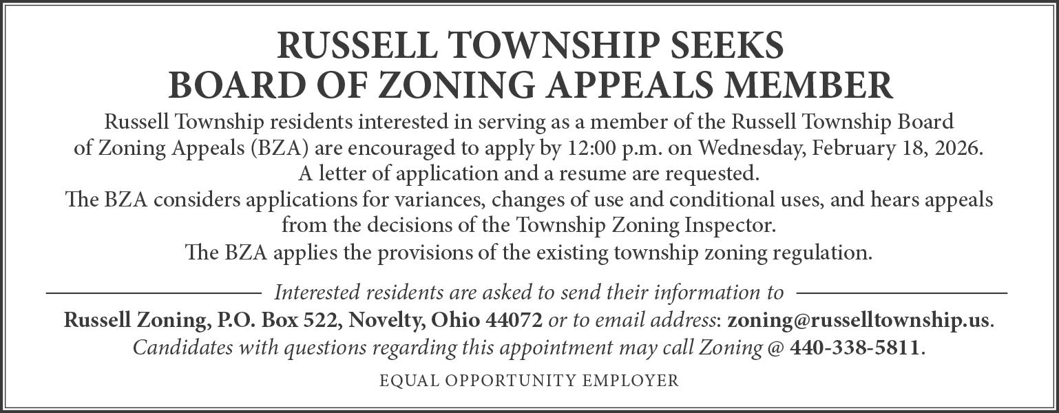 Notice is hereby given that the Russell Township Board of Zoning Appeals will have one Public Hearing on an application appeal for a variance to the Russell Township Zoning Resolution on Monday, February 9, 2026, at 7:00 p.m. in the Russell Township Community Room, 8501 Kinsman Road, Novelty, Ohio 44072.
