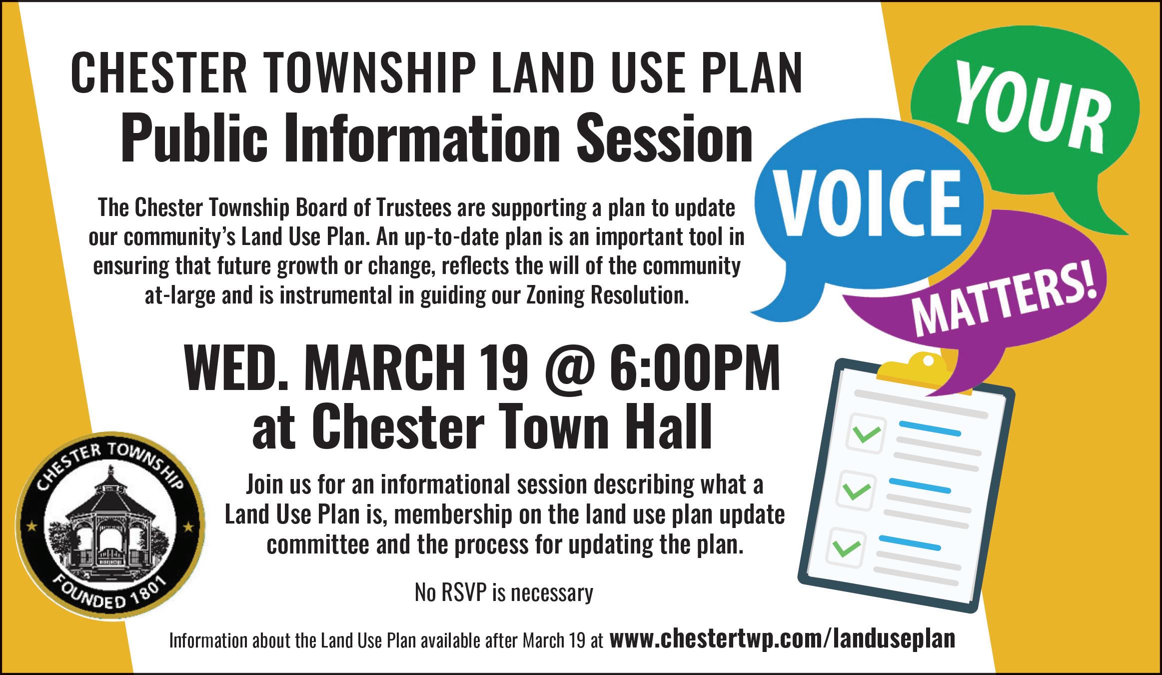Chester Township: March 6, 7 a.m. – Board of Trustees, special meeting, 5:30 p.m. –Board of Trustees, regular meeting (time change), 7 p.m. – Zoning Commission, meeting with Board of Trustees; March 10, 7 p.m., Board of Zoning Appeals. All meetings are held at Township Hall, 12701 Chillicothe Road, unless otherwise noted.