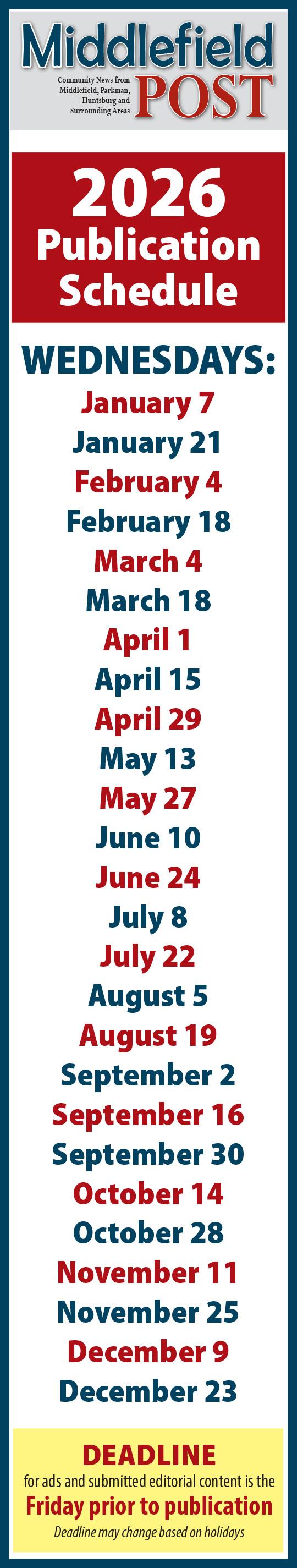 • The space reservation deadline for paid advertisements in that week’s Middlefield Post is 4 p.m. on the Thursday prior to publication. Late ads may be accepted at the discretion of management.