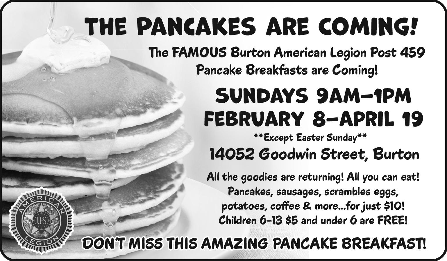 Burton Middlefield American Legion Atwood-Mauck Post 459 is serving its annual all-you-can-eat pancake, sausage and scrambled eggs breakfasts every Sunday through April 19, excluding Easter, at the post located at 14052 Goodwin St. in Burton.