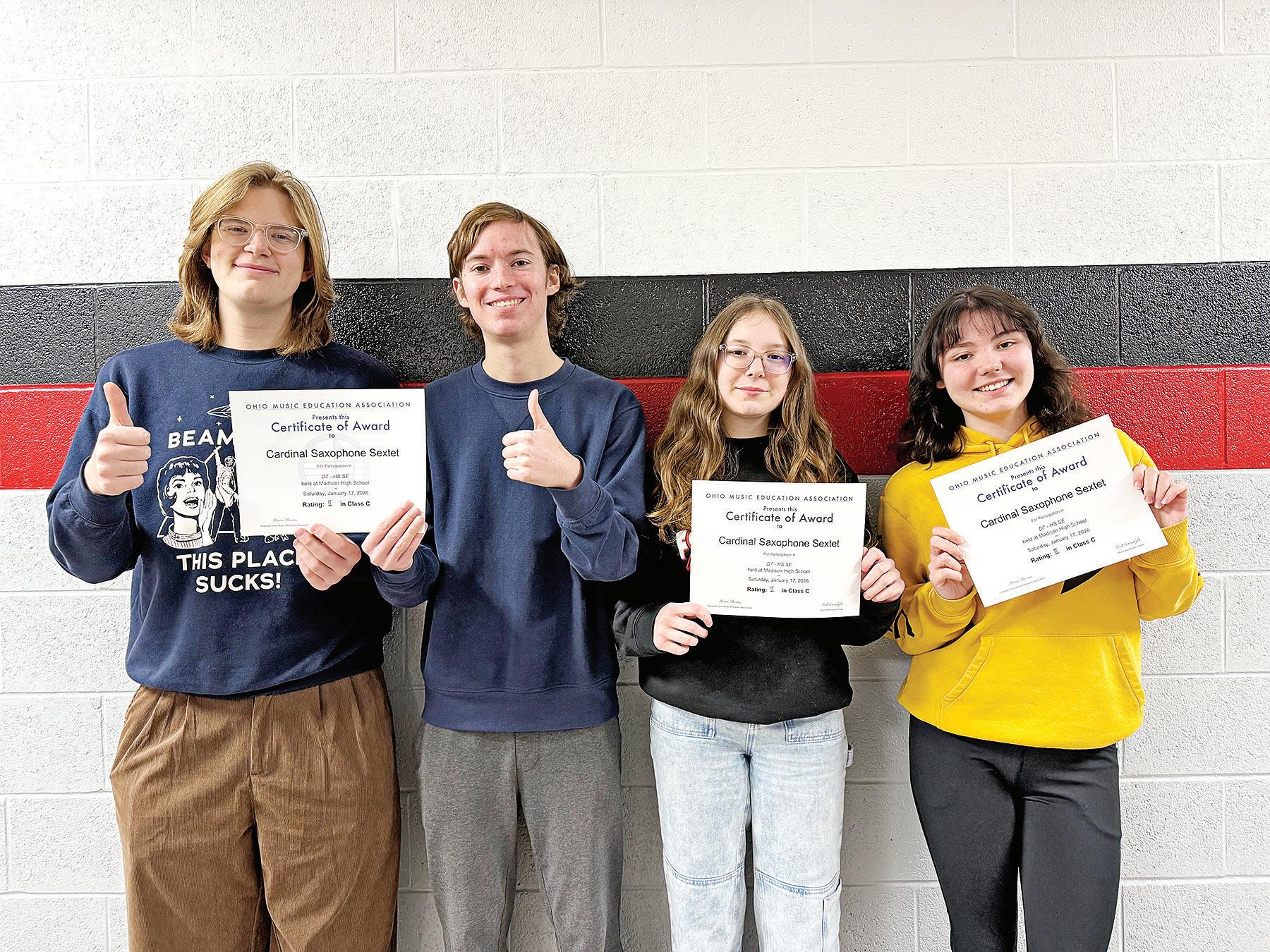 Members of the Cardinal Saxophone Ensemble earned a Class C rating of 2: Kara Everett, Alaina Hickox and Lucas Gresch (alto saxophones), Grayson Yoder (tenor saxophone), Emma Clinger (tenor saxophone) and John Loving (baritone saxophone).