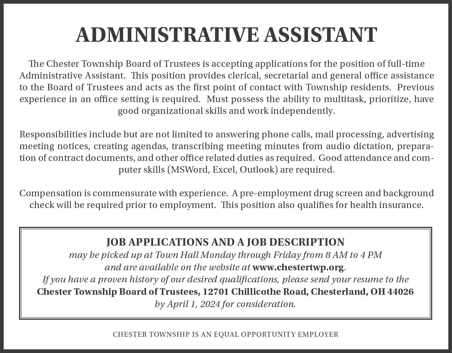 Chester Township: March 20, 7 p.m., Zoning Commission; March 21, 6:30 p.m., Board of Trustees. All meetings are held at the Township Hall, 12701 Chillicothe Road, unless otherwise noted.