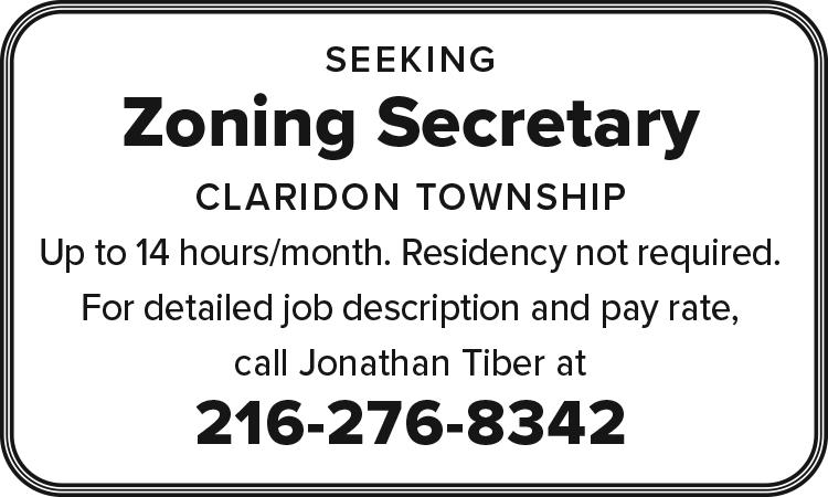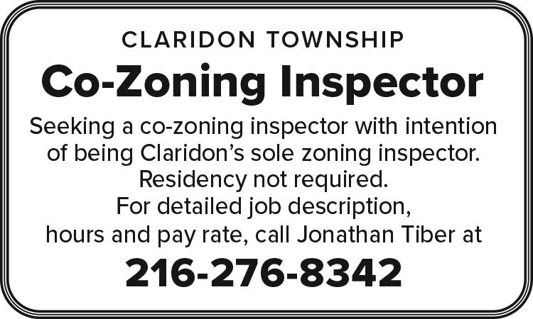 Claridon Township: Oct. 7, 6 p.m., Board of Trustees. All trustees’ meetings are held at Administrative Building, 13932 Mayfield Road, unless noted. All Zoning Commission and Board of Zoning Appeals meetings are held at Town Hall, 13930 Mayfield Road. Hambden Township: Oct. 7, 7 p.m., Zoning Commission. All meetings are held at the Town Hall, 13887 GAR Highway, unless otherwise noted.