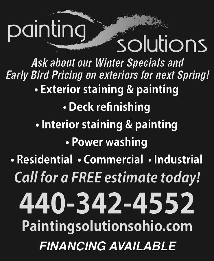 Offering special discounts for interior and exterior painting and staining. 20+ years experience. Professional and insured. Call Dan 440-342-4552. Joe Eicher doing roofing, siding, remodeling, cleanout houses, we do most anything. Call between 8a-4p, 440-813-4272. No answer, leave message.