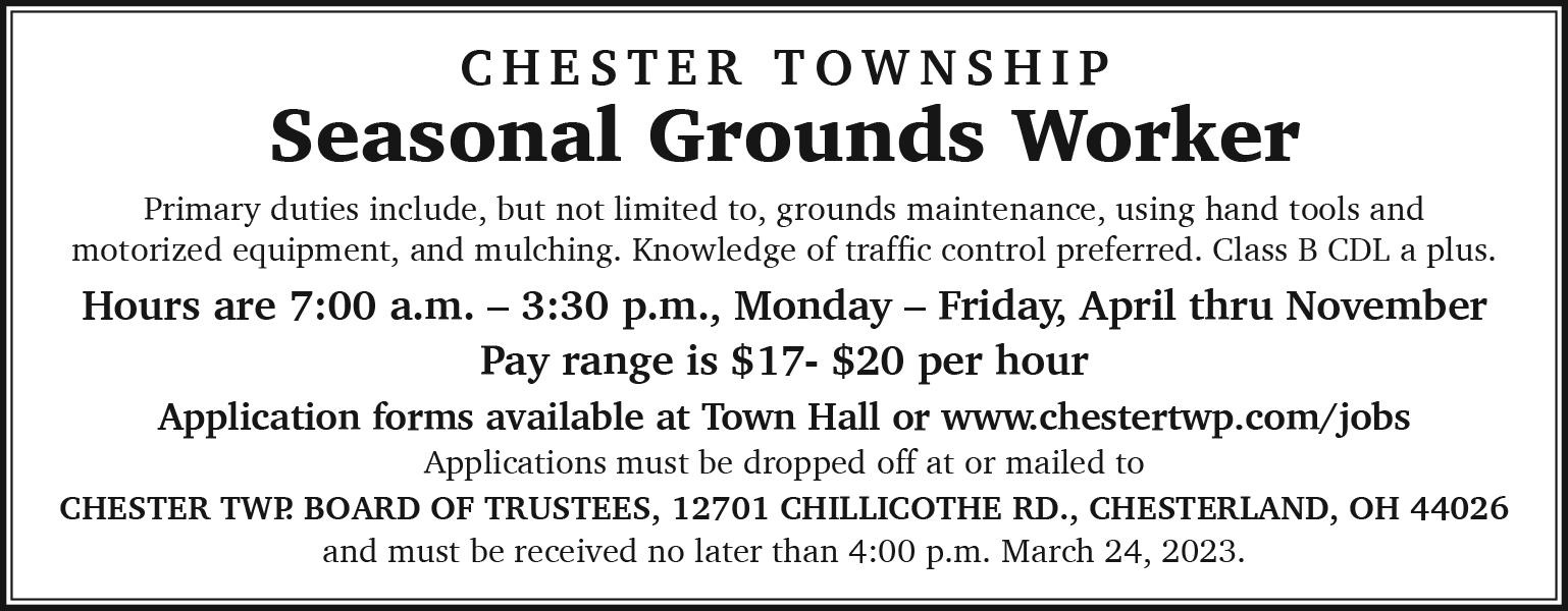 Chester Township: March 9, 6:30 p.m., Board of Trustees; March 13, 7 p.m., Board of Zoning Appeals; March 15, 7 p.m., Zoning Commission. All meetings are held at the Township Hall, 12701 Chillicothe Road, unless otherwise noted.