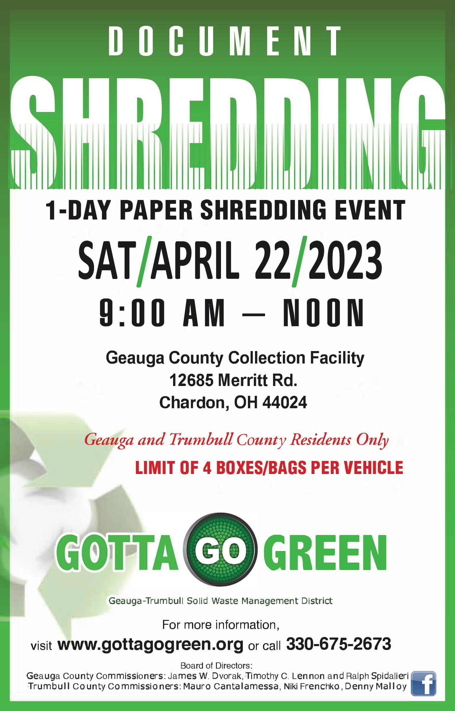 Geauga County: April 25, 9:30 a.m., Geauga County Commissioners; April 26, 5 p.m., Board of Health, Ste. 300. All county meetings are held at the Geauga County Administrative Building, 12611 Ravenwood Drive (Ste. #), Claridon, unless otherwise noted. County commissioners meetings are held in Suite 350.