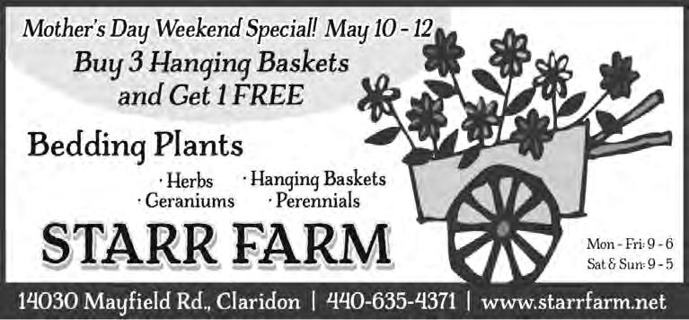 The Perennial Gardeners of Chesterland’s annual plant sale in the parking lot of Chester Town Hall, 12701 Chillicothe Road, features a large assortment of hanging baskets, perennials, natives, houseplants, herbs and annuals. Check out the Garden Shed and the boutique for unique items related to home and garden. Gift certificates are available now. Sale will be held rain or shine. For more information, email perennialgardenerschesterland@gmail.com.