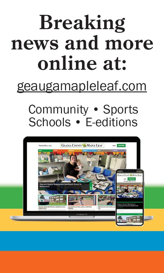 •Geauga County Maple Leaf (USPS 011-535) is published weekly by Geauga County Maple Leaf LLC. 8389 Mayfield Road, Ste. B5, Chesterland, Ohio 44026. Periodicals postage paid at Chardon, Ohio 44024. POSTMASTER: Send address changes to Geauga County Maple Leaf, P.O. Box 1166, Chardon, OH 44024-5166. Subscribers should notify the publisher in writing of address changes or unsatisfactory delivery.
