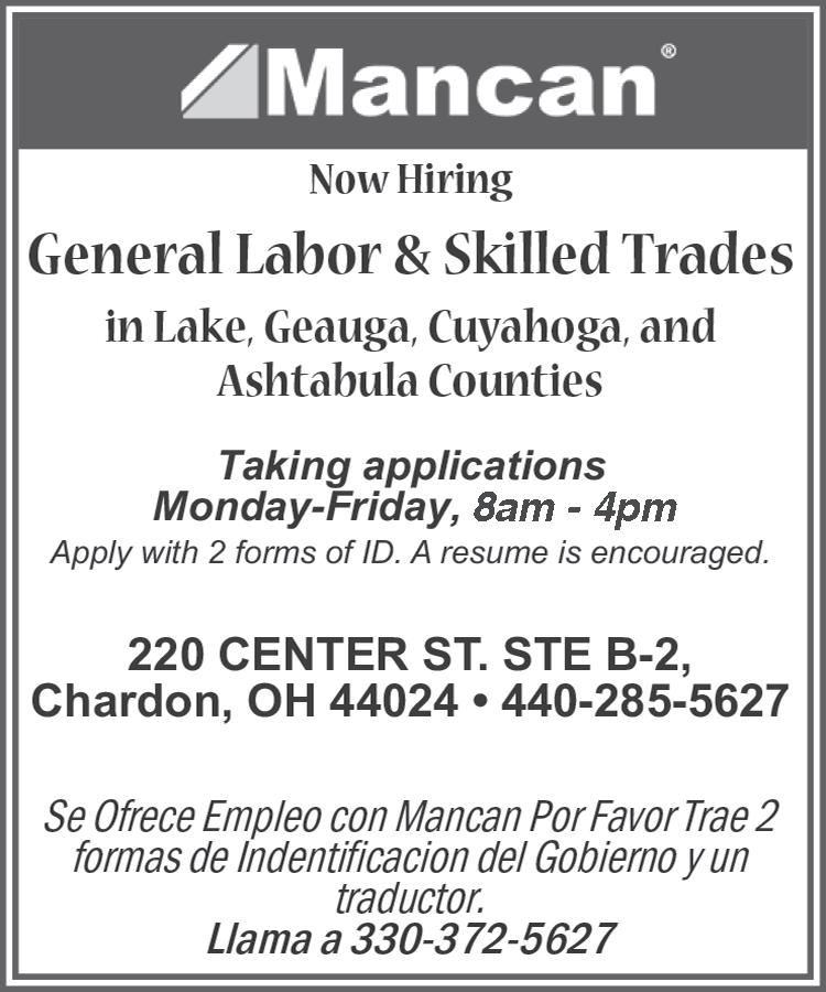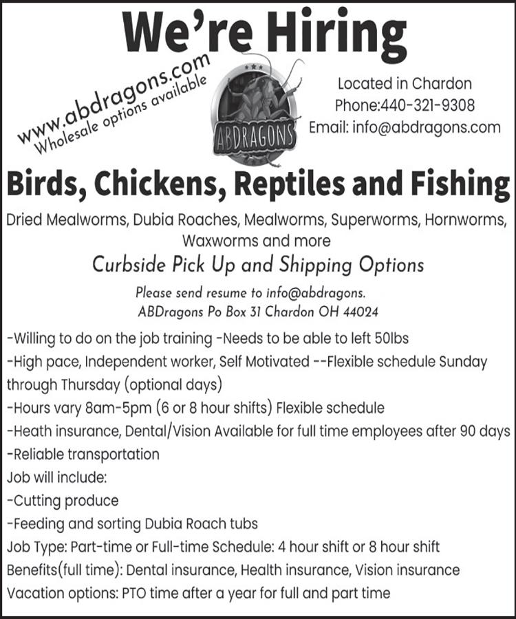 Help Wanted: afternoon & weekends $15.00 an hour. Dependable, 18+, licensed preferred. Chagrin Oil & Gas, Middlefield OH. Apply in store or call 440-632-1501.