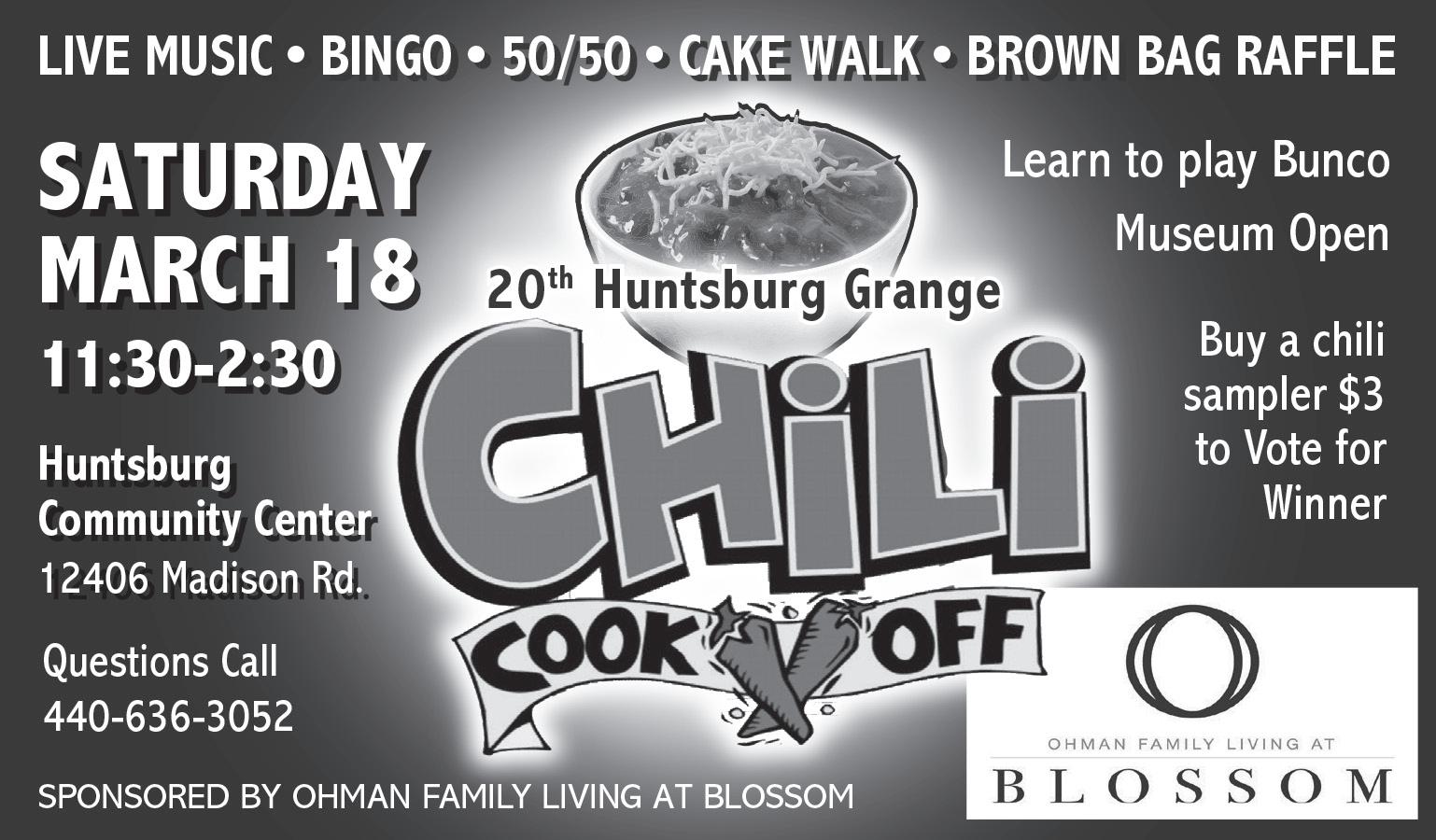 The chili cook-off is March 18 from11:30 a.m. to 2:30 p.m. at the Huntsburg Community Center, 12406 Madison Road. For more information on the event or about the Huntsburg Grange, call Jean at 440-286-4992 or Lynnette at 440-477-2822.