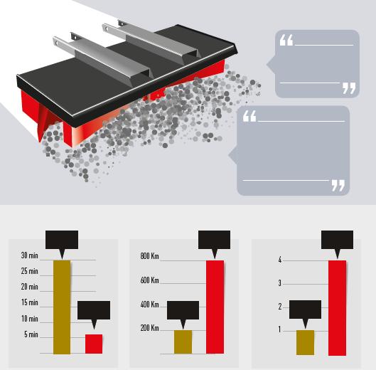 Le balai CLEANsweep a une durée de vie jusqu‘à 800 km avec les brosses hautes performances. Cela correspond avec environ 4 fois la durée de vie une brosse à rouleau rotative.