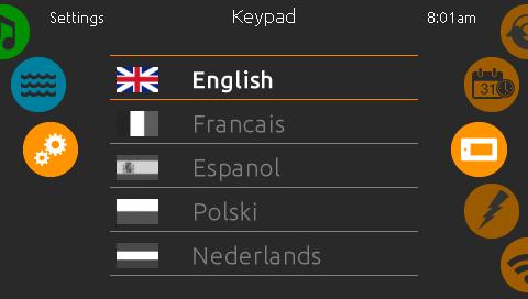To modify keypad settings, slide the right wheel until the keypad icon is highlighted in the middle. Simply touch the line of the item you want to change.