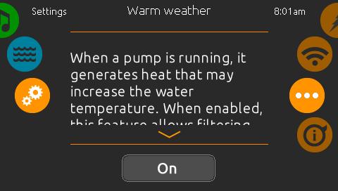 The Water care page will help you set up your ideal filtration and heating settings. Choose, set or modify one of the 5 suggested modes depending on your needs at any given time.