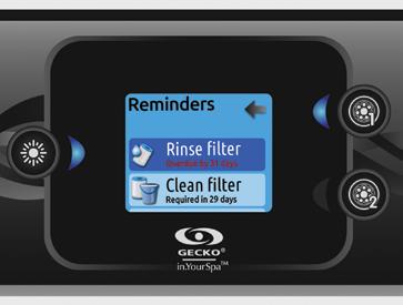 The in.k500 keypad will remind you of maintenance required on your spa, like rinsing or cleaning the filter. Each task has its own duration, based on normal use. The Maintenance reminders menu allows you to verify the time left before maintenance is required, as well as to reset the time once a task is completed. Use the Up and Down keys to move through the list.