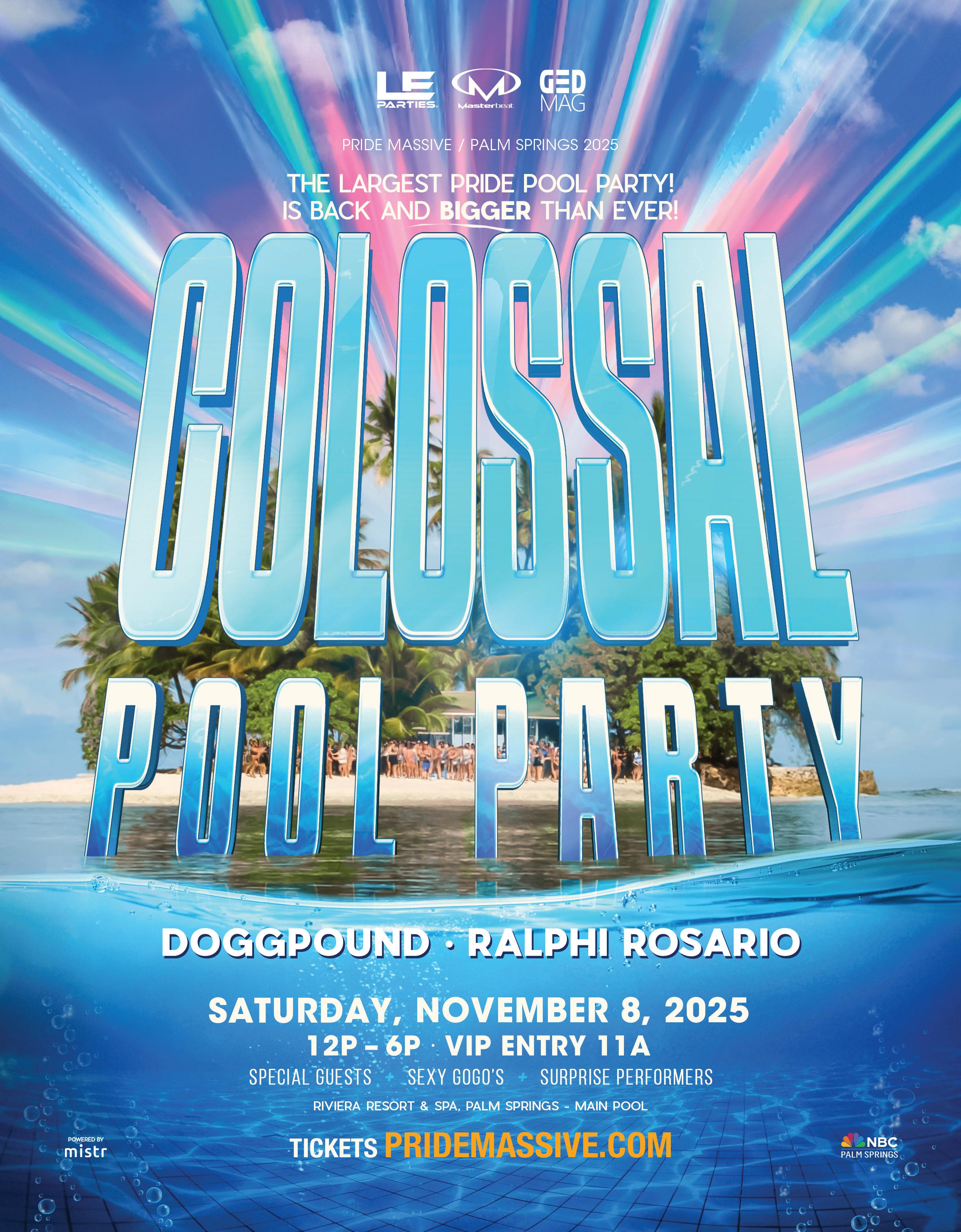 Here in Palm Springs, Pride is almost upon us, and GED and LE Parties have FIVE events during Pride weekend for your enjoyment –Friday night at 7pm is DRAG-A-LICIOUS, the largest Drag Show in town taking over the ballroom of the Riviera Resort, followed by EUPHORIA at Reforma starting at 10pm; Saturday is our highly anticipated pool party COLOSSAL from 12-6pm, followed by the evening
