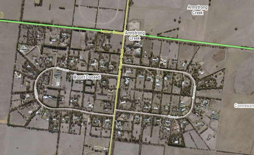 The Mount Duneed Plain and Surrounds is a flat-to gently-undulating landscape formed by volcanic flows of basalt. It includes the low, volcanic rise of Mount Duneed itself, with its unique geology and communities of grasslands. It also includes Thompson Creek, which winds its way from the coast at Breamlea, its upper and middle reaches cutting a pathway through the patchwork of paddocks that characterise this agricultural landscape. Remnant eucalypts are a further feature of this landscape, found in riparian reserves, adjacent to road corridors and scattered throughout paddocks. They contrast with the mostly exotic, lineal shelterbelt planting. This is an open, expansive landscape of long, straight roads under big skies. It is a very important green break between the built-up areas of Geelong and Torquay and the settlements of the Bellarine Peninsula.