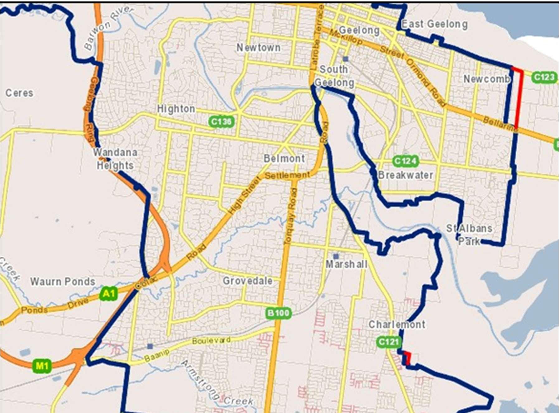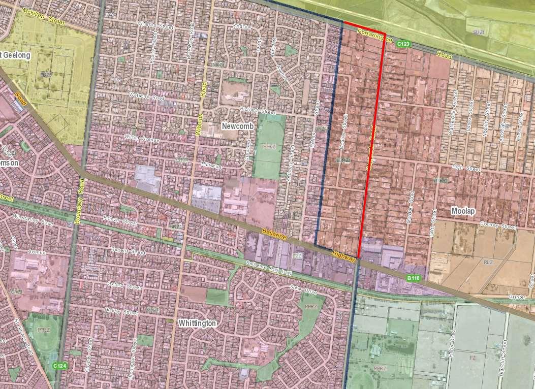 The boundary aligns with the suburb boundary between Newcomb and Moolap.