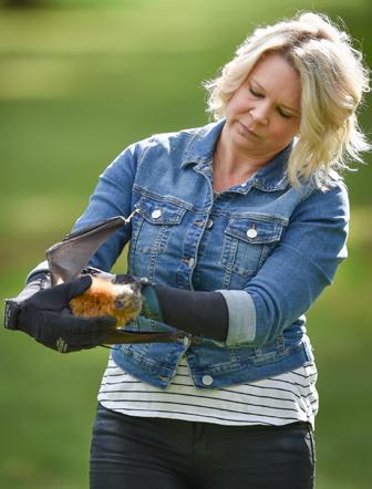 “THEY’RE ONE OF OUR MOST MISUNDERSTOOD ANIMALS BECAUSE THEY PLAY A HUGE ROLE IN DISPERSING SEEDS AND POLLINATING TREES SUCH AS EUCALYPTS,”Pictured: Veterinary nurse and volunteer wildlife carer, Leila Moody, with Daphne the flying fox