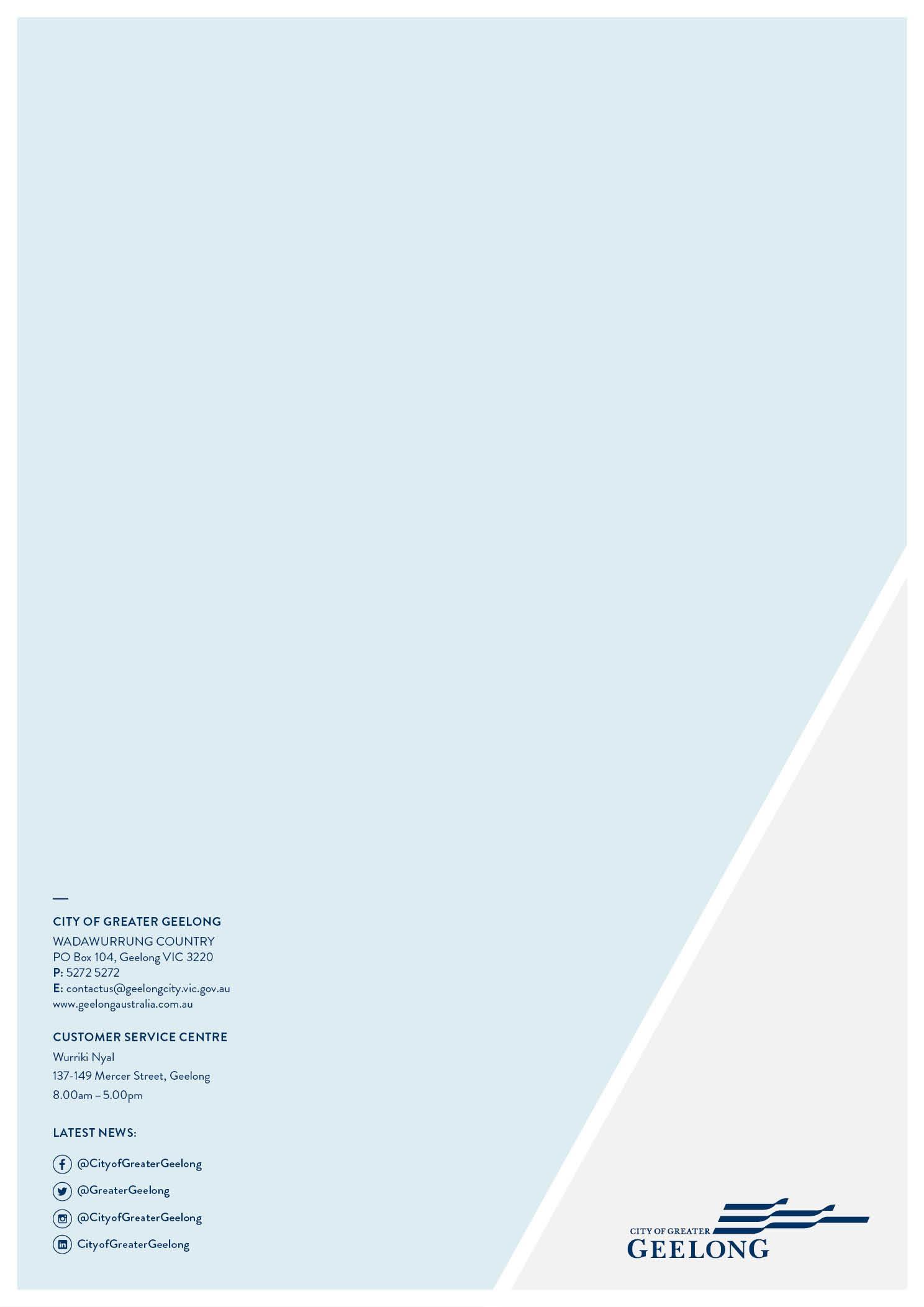 The City of Greater Geelong is on Wadawurrung Country. We acknowledge the Wadawurrung People as the Traditional Owners of the Land, Waterways and Skies. We pay our respects to their Elders, past and present and emerging.