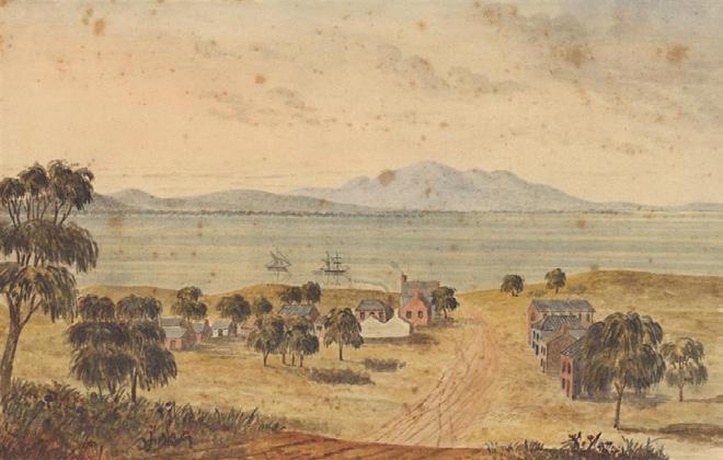G.A. Gilbert, Geelong Bay looking towards Mt. Martha Ranges, 1850