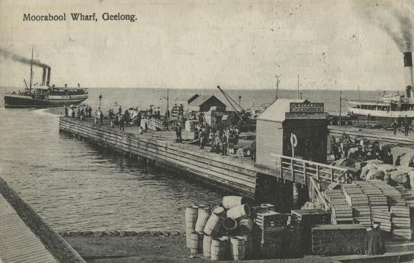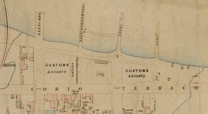 Locations of wharfs on the Geelong foreshore in 1854. Left to right: Moorabool Wharf, Steampacket Wharf, Yarra Street Wharf & Queens Wharf. Source: J.H. Taylor, Map of Geelong, Surveyor-General’s Department, Melbourne, 1854