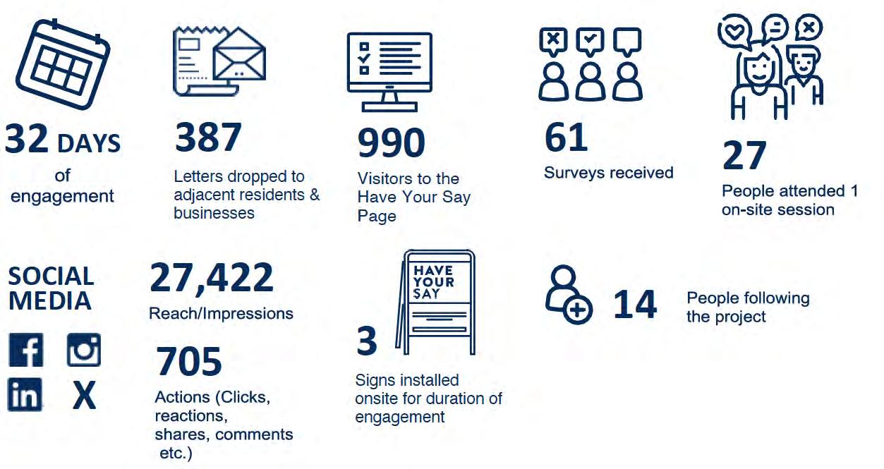 Community engagement was conducted in April and May 2023. The purpose of the engagement was to gain broad community feedback on the Draft Master Plan and insight into the participants level of involvement in the project, their key priorities, and sentiments.