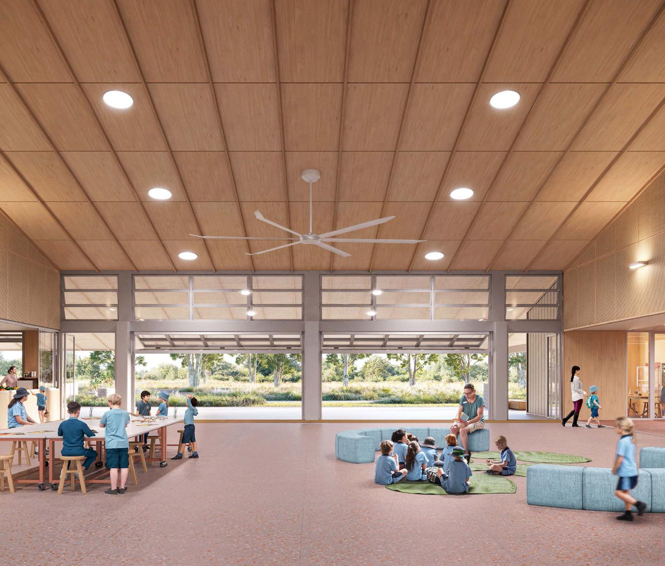 Flexible teaching and learning spaces line the eastern side, catering to students from Prep to Year 4. This area also houses the library and art studio, creating a dynamic and engaging environment for exploration and creativity. On the western side, administration, staff spaces and a nutrition kitchen provide essential support for the daily operations of the School.
