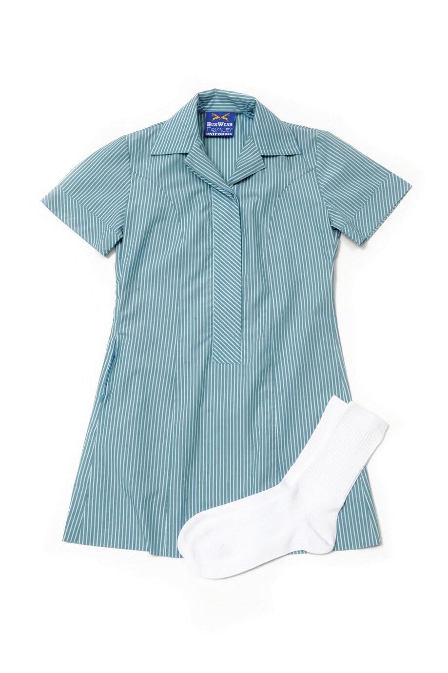 - Summer: dress or grey shorts with short-sleeve blue shirt