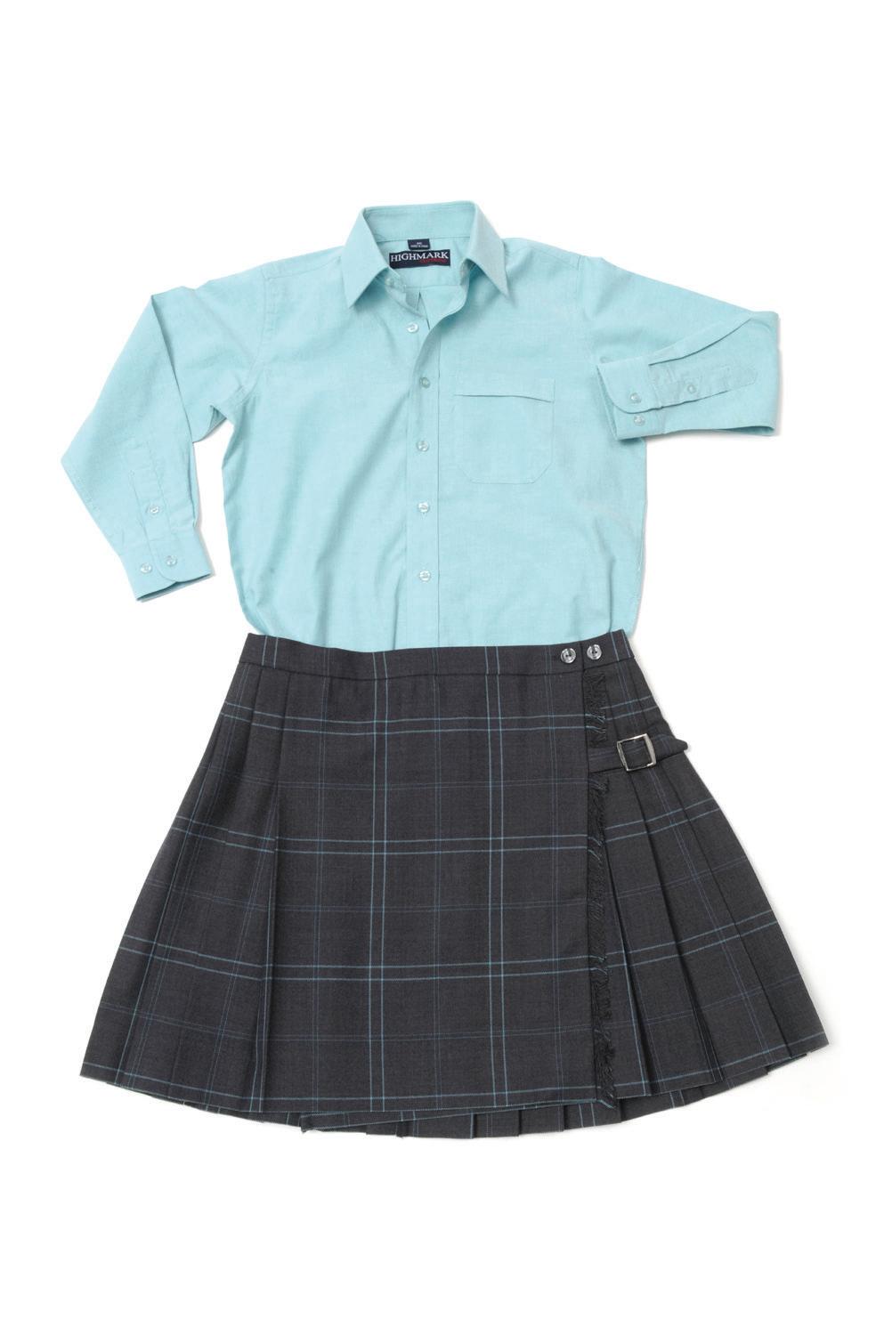 - Winter: grey kilt or pinafore, worn with blue short-sleeve or long-sleeve shirt, or grey pants worn with blue short-sleeve or long-sleeve shirt