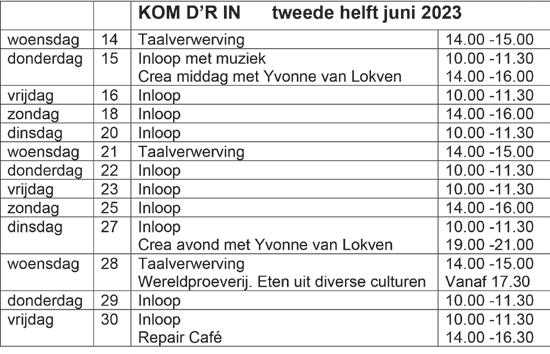 Gezellig samen eten, helemaal verzorgd.Van ma. t/m za. vanaf 12.00 uur kunt u terecht in Kom d’r In. Aanmelden bij Tonny van Erp 0735321955 of Tineke Willemse 0610758924.