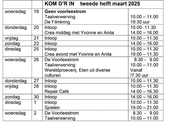 Gezellig samen eten, helemaal verzorgd.Van ma. t/m za. vanaf 12.00 uur kunt u terecht in Kom d’r In. Aanmelden bij Tonny van Erp 0735321995 of Tineke Willemse 0610758924.