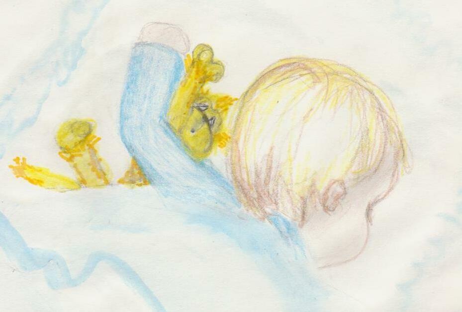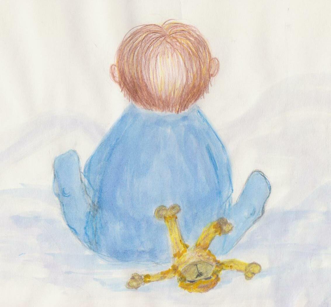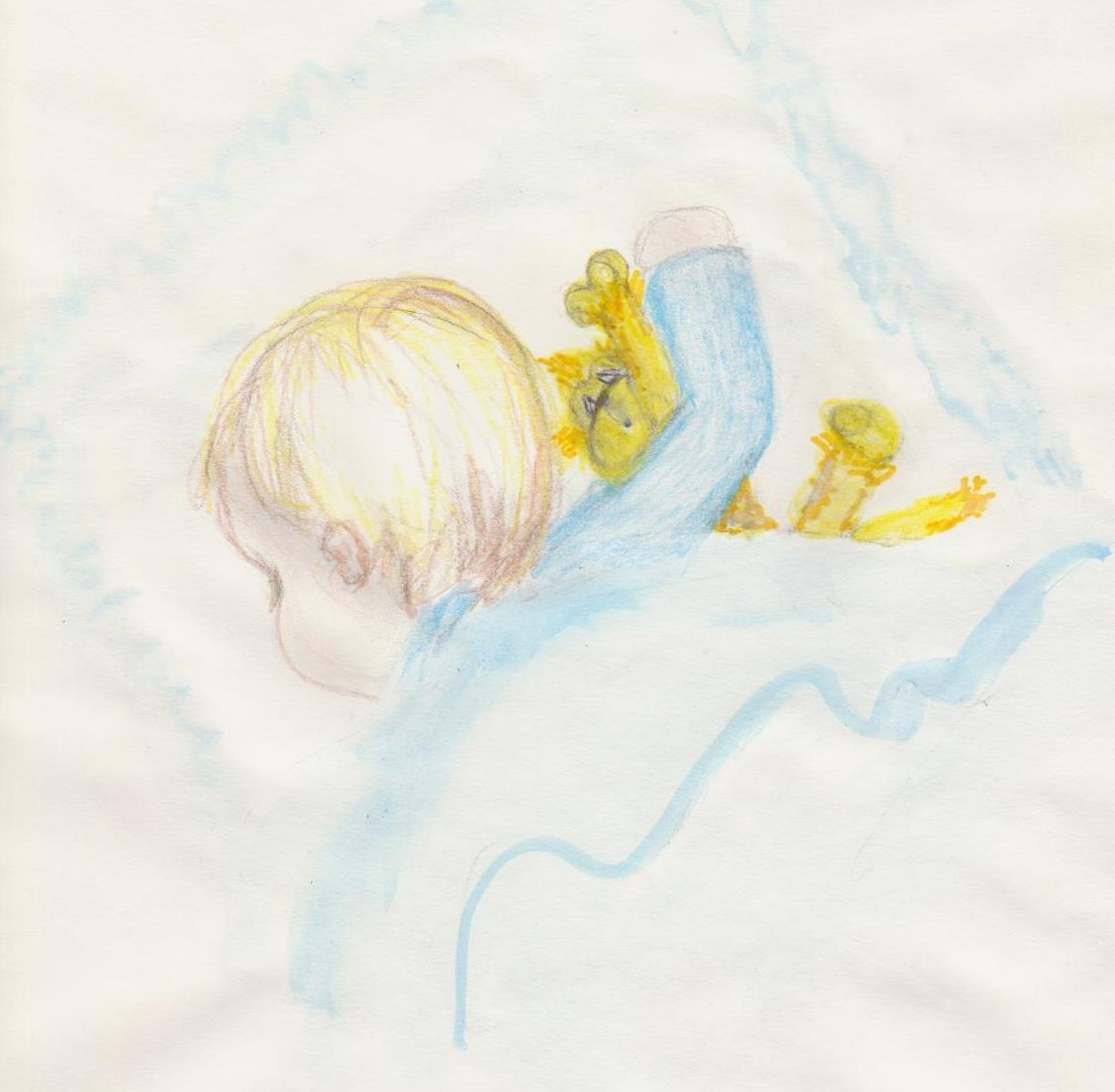 Doodie‘s mom, for sure, places many soft toys all around Doodie in his bed, - but the little monkey is missing. (tusku-dýr)