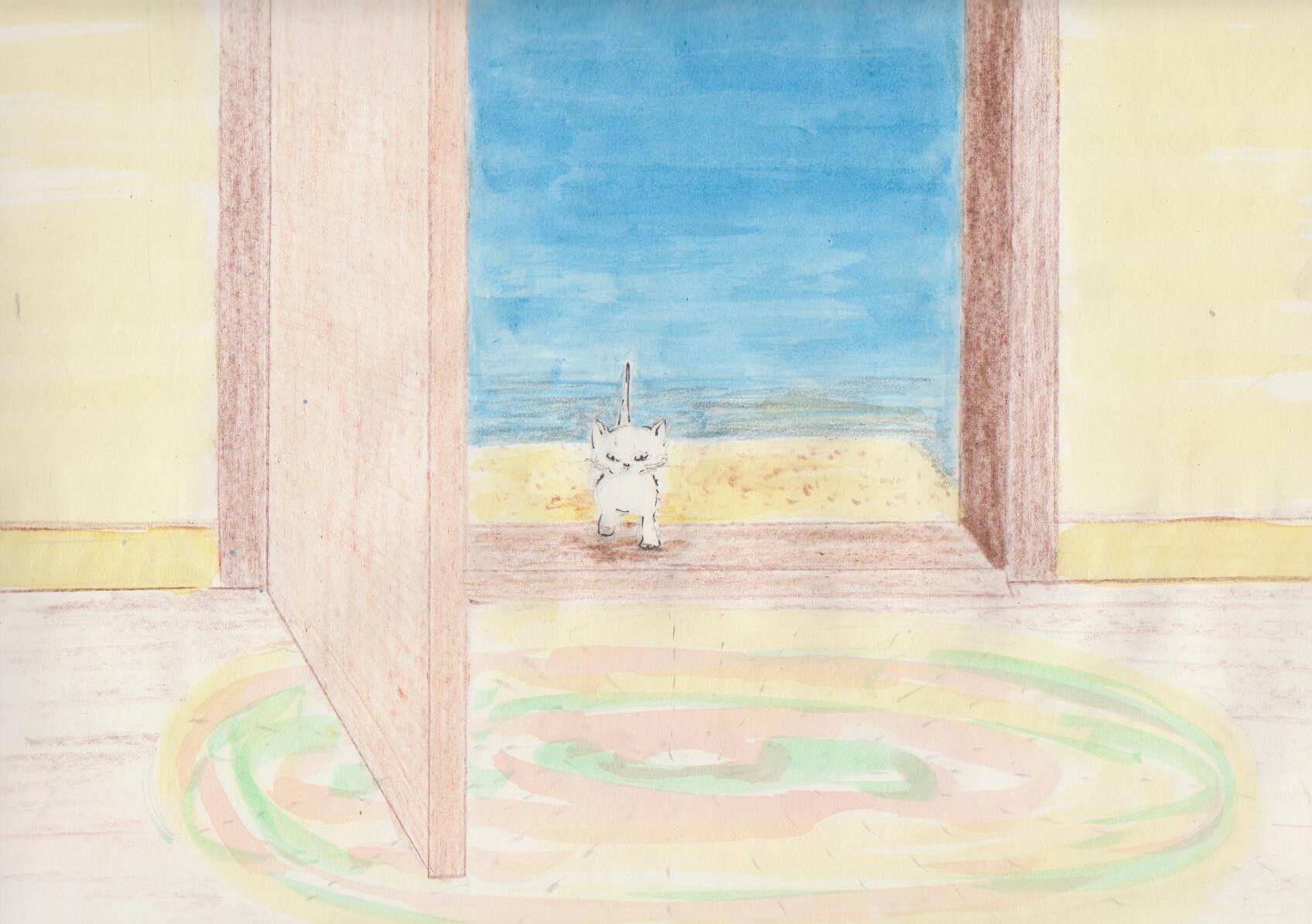 Ámátlegt mjálm úti. Gamli maðurinn opnar. Inn trítlar agnarsmár kettlingur, sem er alveg villtur.
