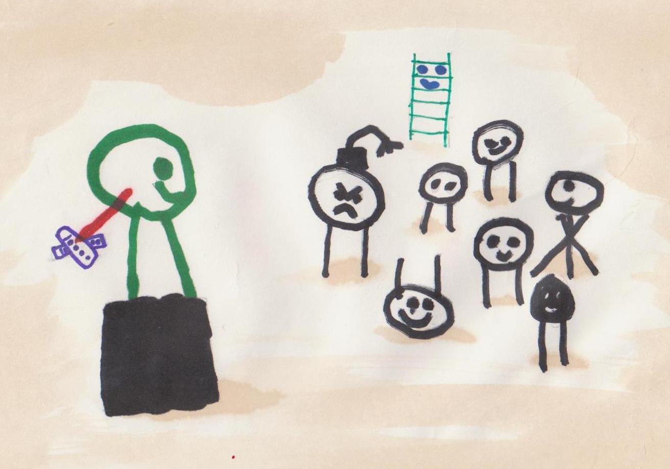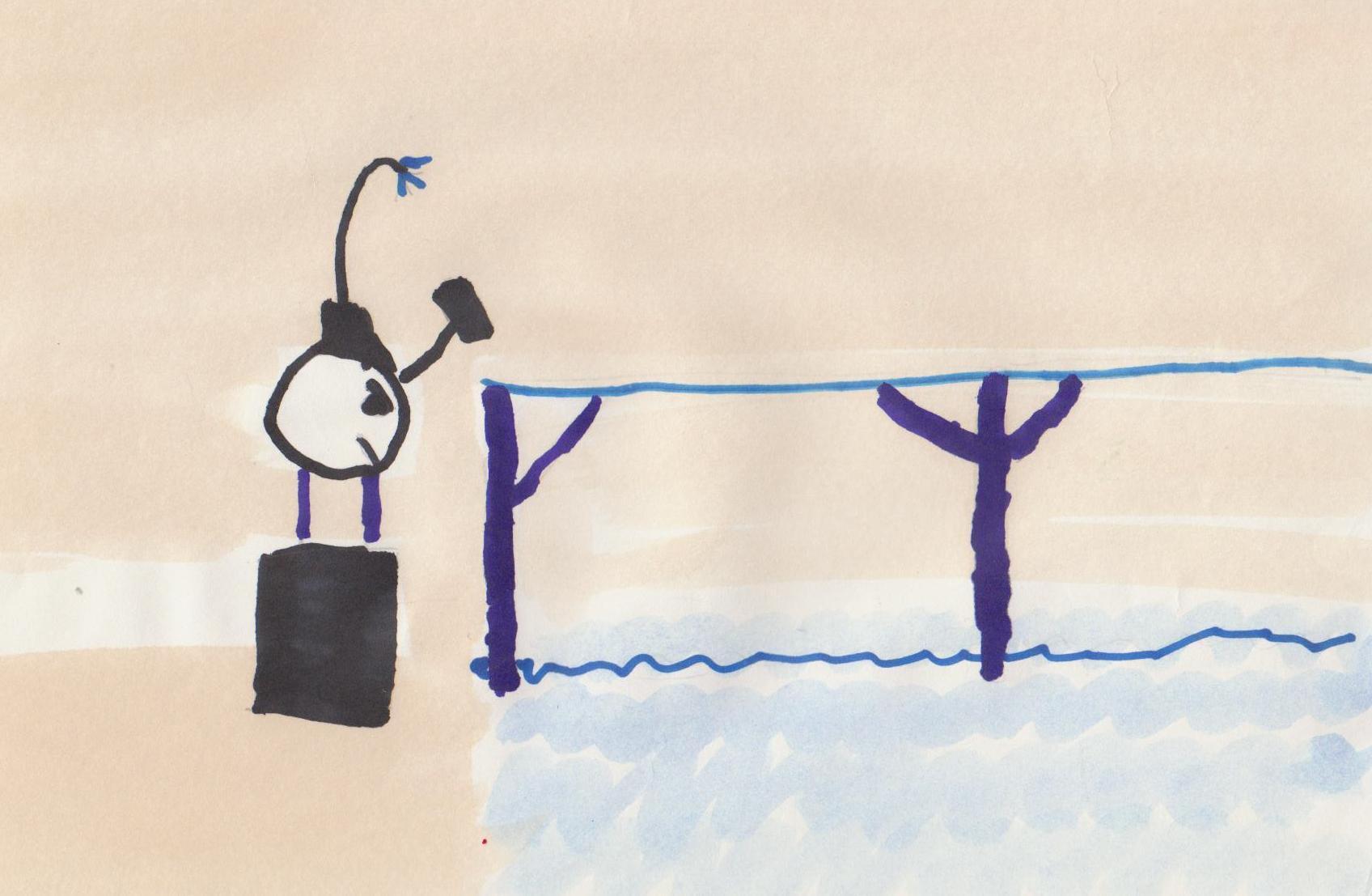 The Bomb alien is also going to build a bridge and chooses this one. But he is too lazy to follow the instructions, and too mean to buy the appropriate material. (sprengi-geim-vera; teikn+ing)