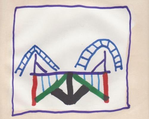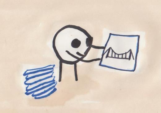 Síðan sest hann niður og fer að teikna brýr. Hann teiknar margar.